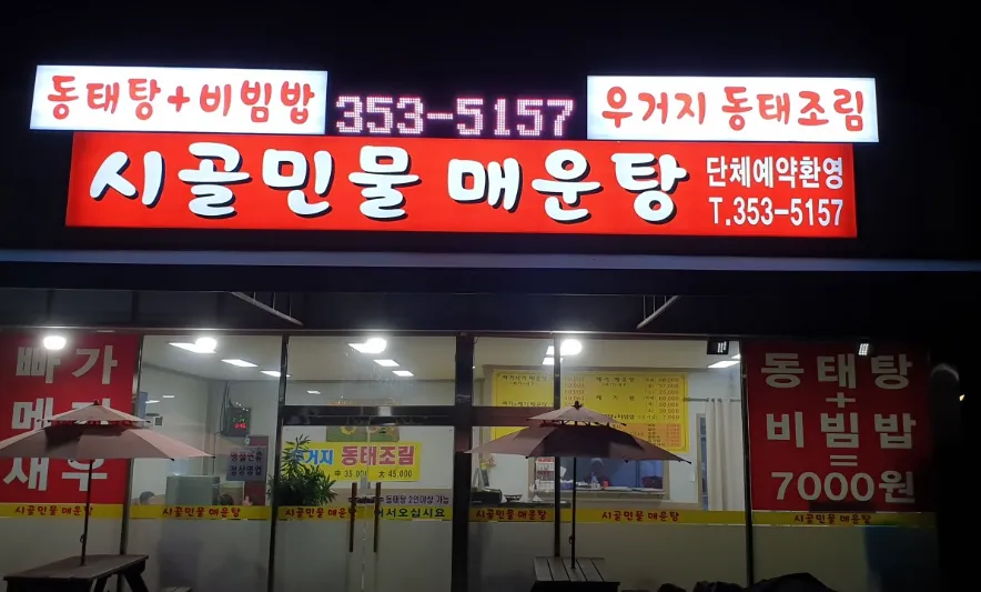 🍚 메뉴: 빠가사리 매운탕, 동태탕+비빔밥 등