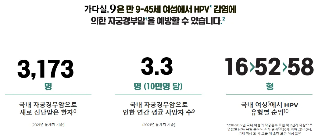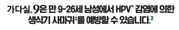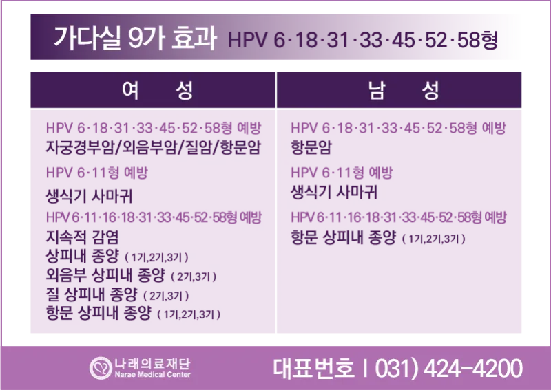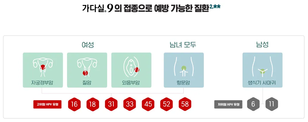 6, 11, 16, 18, 31, 33, 45, 52, 58형 등 총 9가지 고위험 유형의 HPV를 예방합니다.