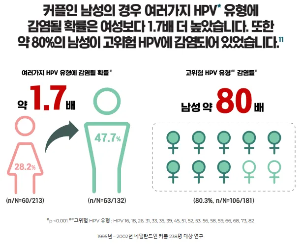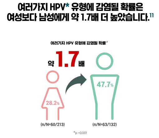 CDC에 따르면 HPV 관련 암의 40%는 남성에게 발생한다고 해요. 특히 구강성교 등으로 인해 두경부암은 여성보다 남성에게 4배나 많다는 통계도 있습니다.