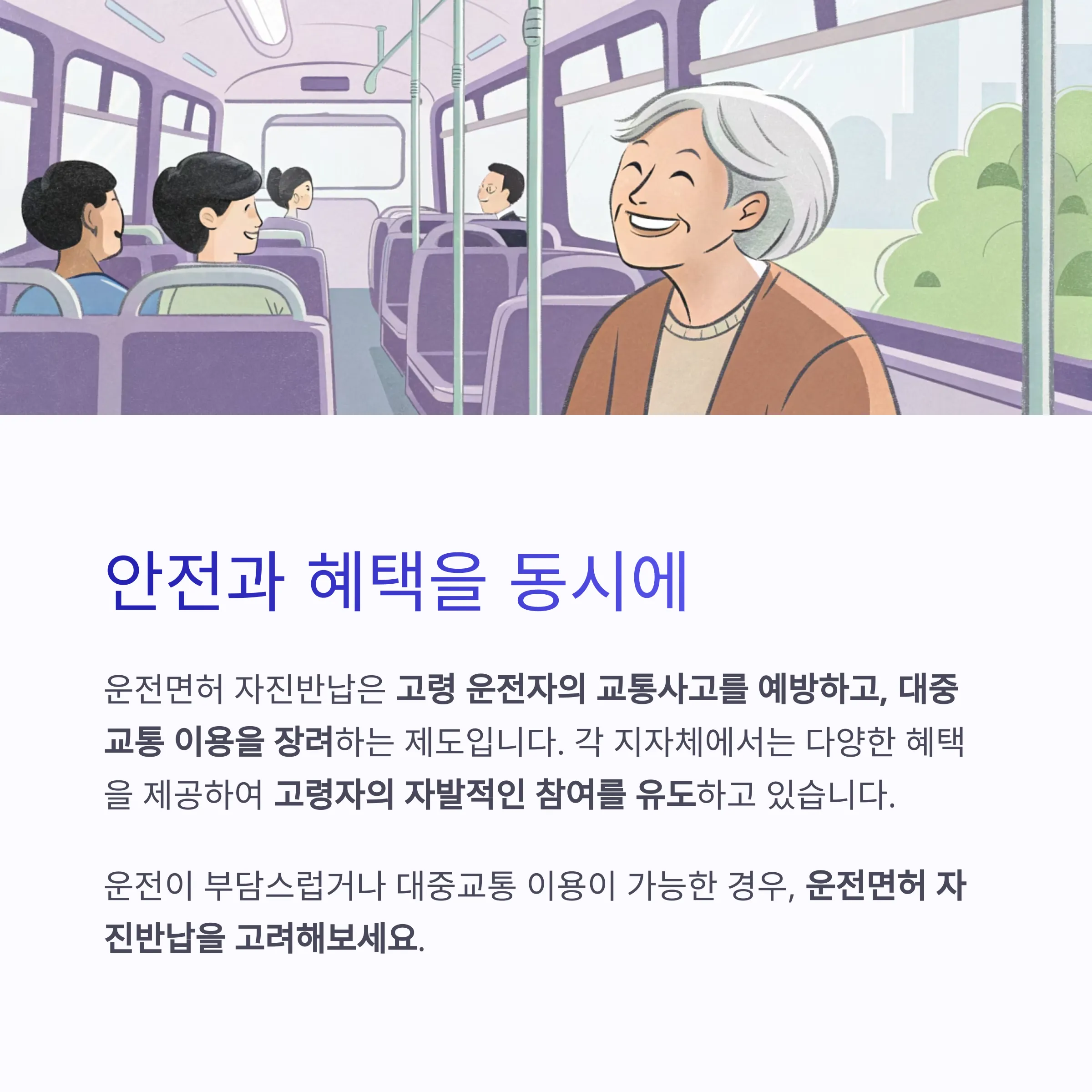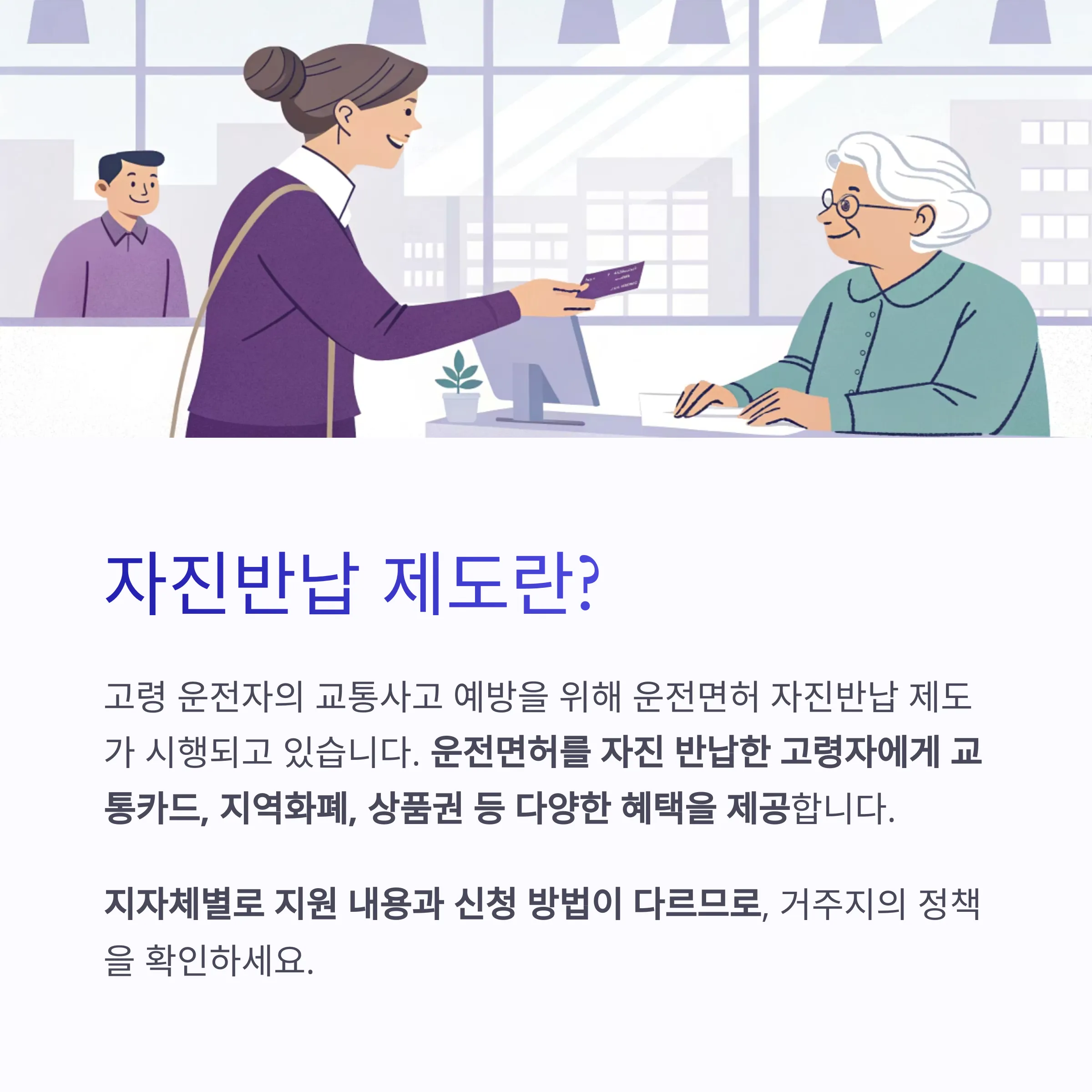 운전면허 자진반납은 고령 운전자의 교통사고를 예방하고, 대중교통 이용을 장려하는 제도입니다.