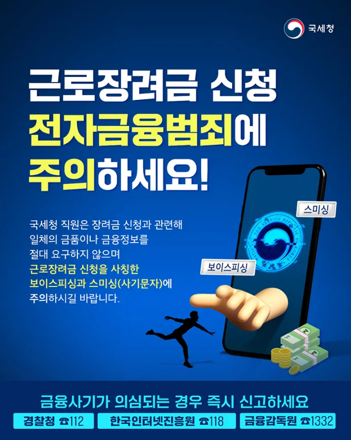 근로장려금 신청 시즌을 악용한 금융사기가 급증하고 있습니다. 보이스피싱, 스미싱, 가짜 사이트 등을 통해 개인정보를 탈취하려는 시도가 계속되고 있으니 주의하세요.