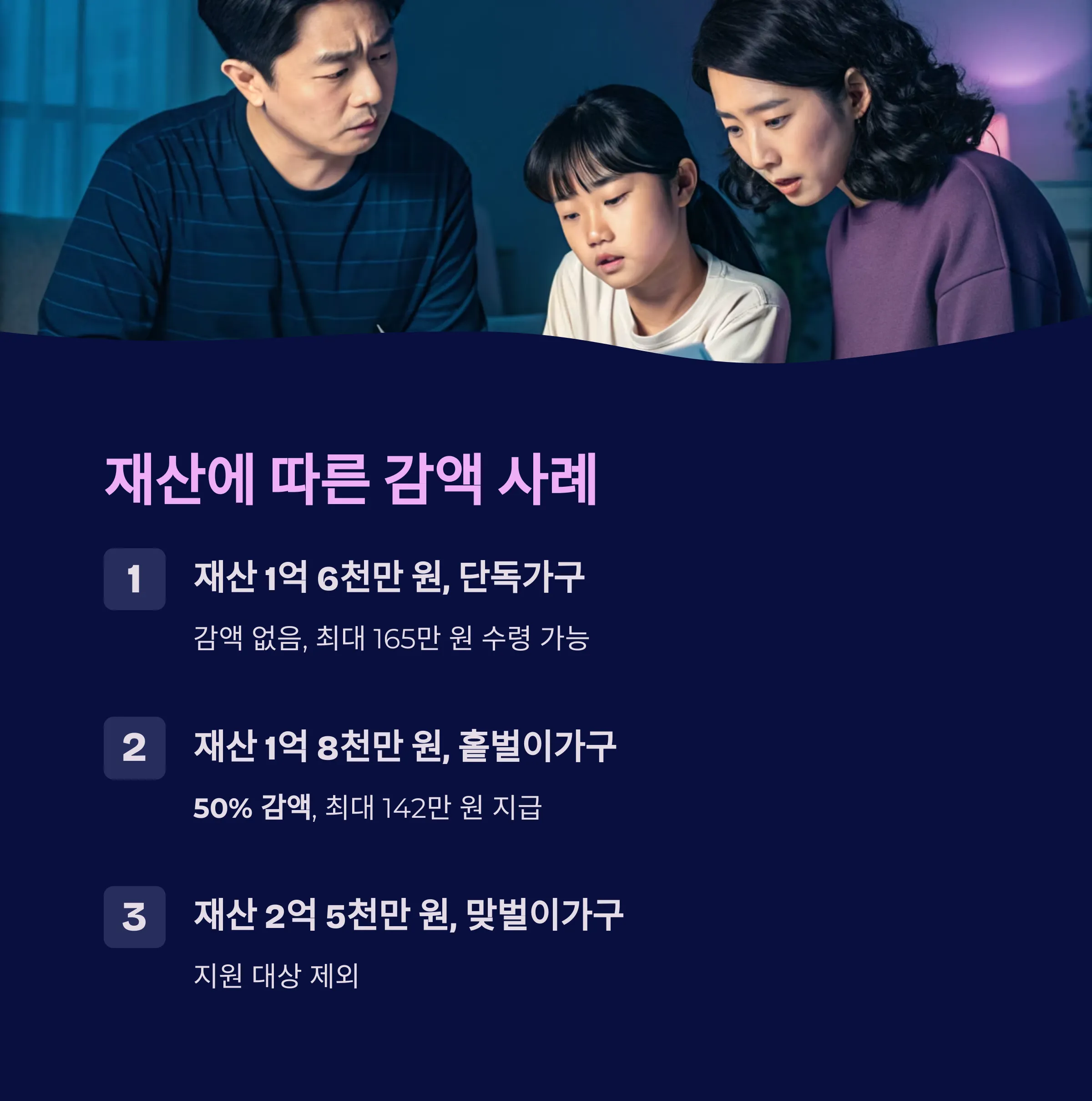| 재산 1억 8천만 원, 홑벌이가구 | 50% 감액, 최대 142만 원 지급 |