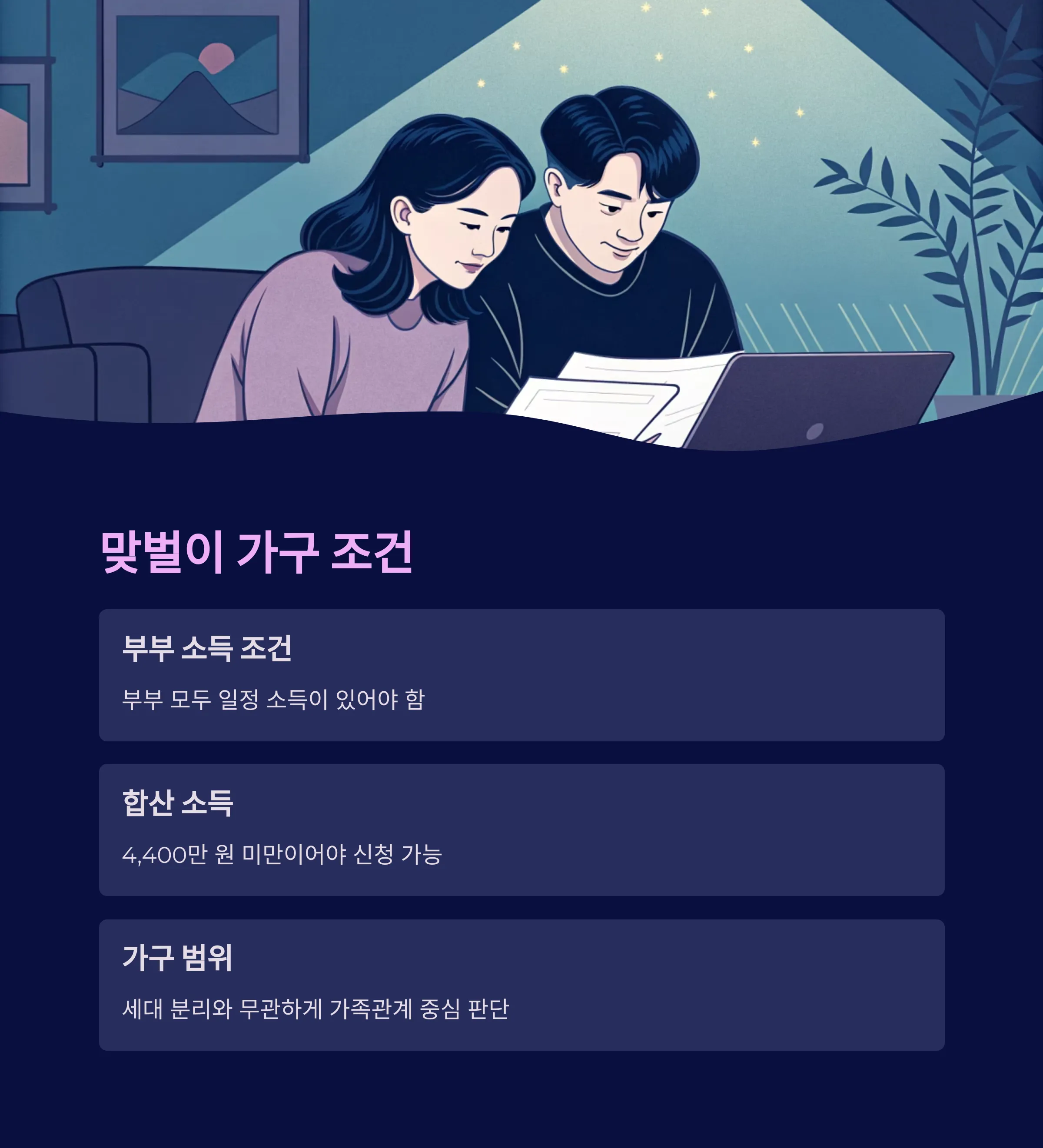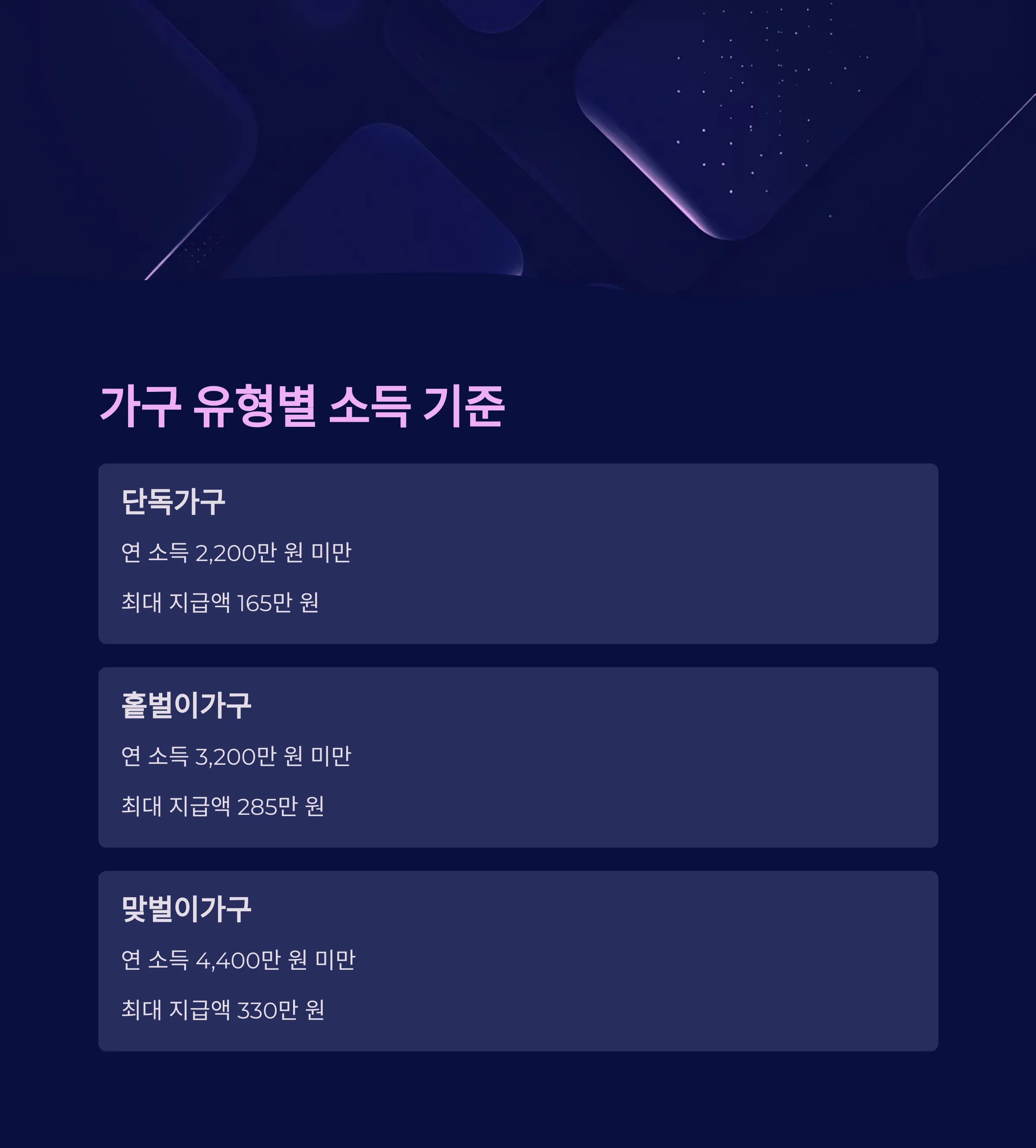 | 소득 기준 | 단독 2,200 / 홑벌이 3,200 / 맞벌이 4,400 미만 |