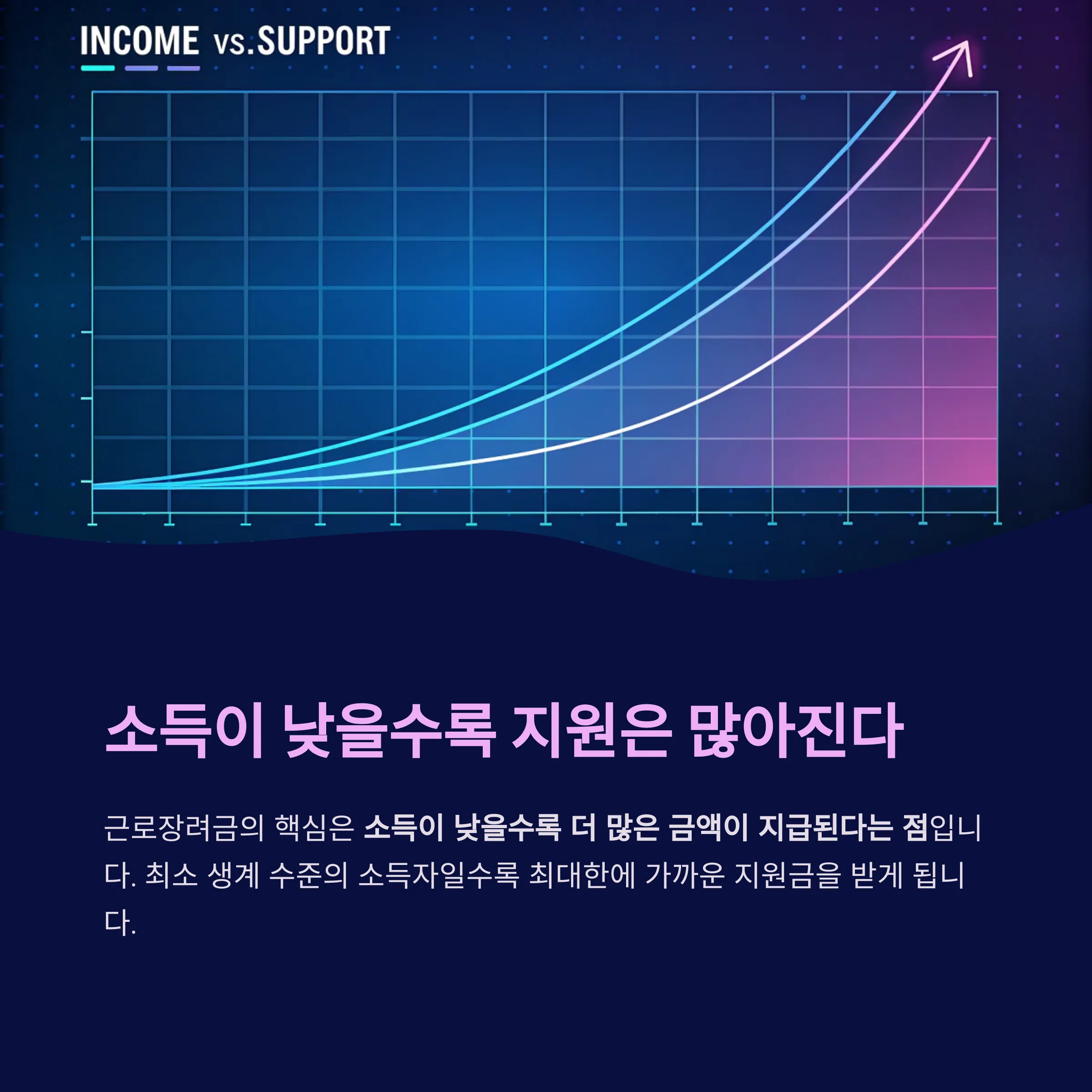근로장려금의 핵심은 소득이 낮을수록 더 많은 금액이 지급된다는 점입니다.