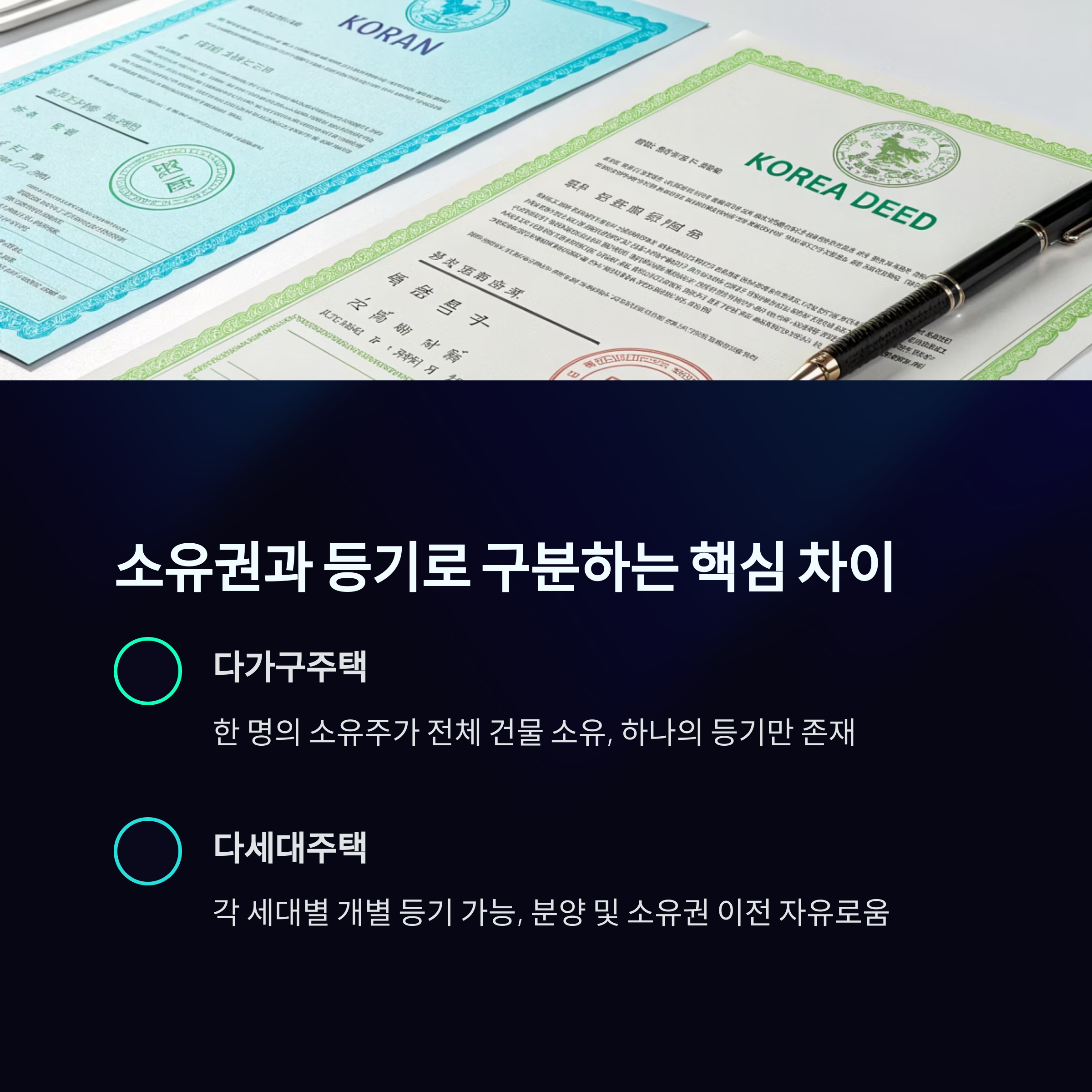 | 등기 여부 | 건물 전체 1개 등기 | 세대별 개별 등기 가능 |