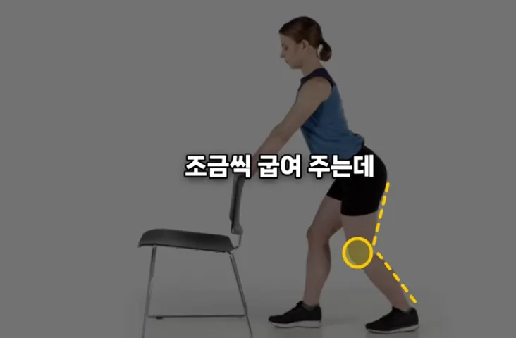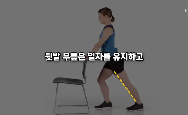 가자미근 스트레칭: 뒷다리 무릎을 굽힌 채 벽 가까이에서 30초 유지