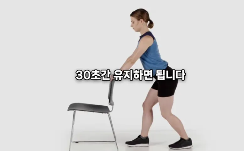 비복근 스트레칭: 벽을 짚고 뒷다리 무릎을 곧게 편 채 발을 멀리 두고 30초 유지