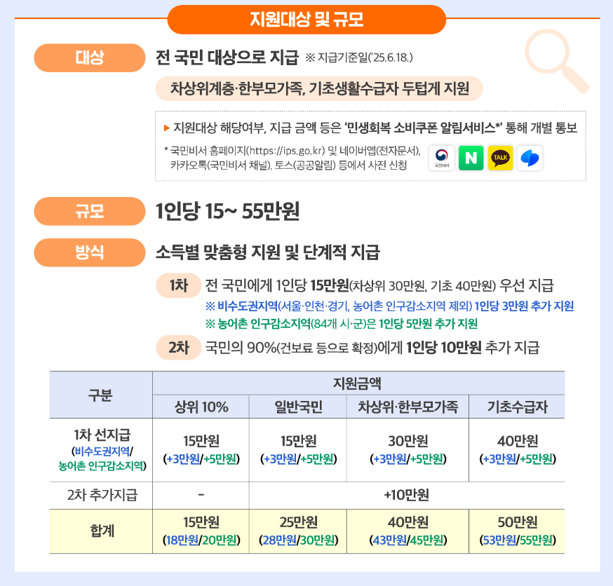 정부가 추진하는 민생회복 소비쿠폰 1차 지급에 대해 많은 분들이 궁금해하시는 내용을 항목별로 자주 묻는 질문(FAQ) 형식으로 정리했습니다.