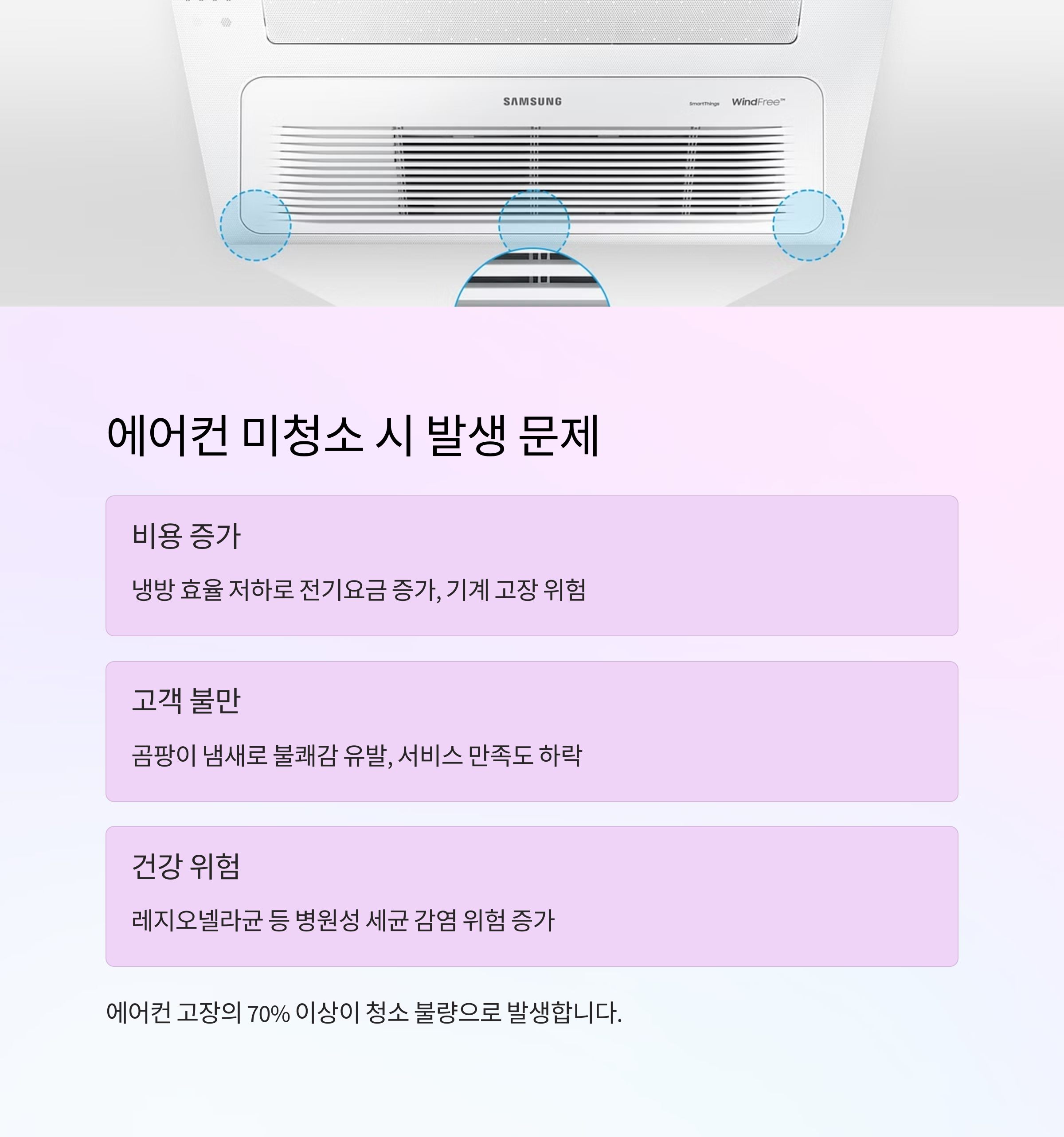 에어컨 고장의 70% 이상이 청소 불량으로 인해 발생합니다.
