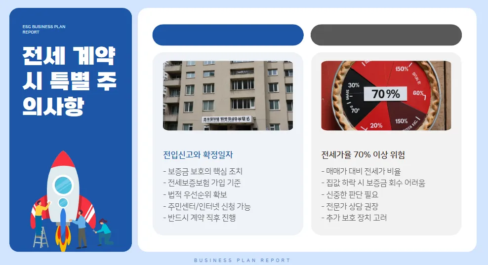 | 전세 계약 시 주의 | 전세가율 70% 이상이면 위험, 확정일자 필수입니다. |