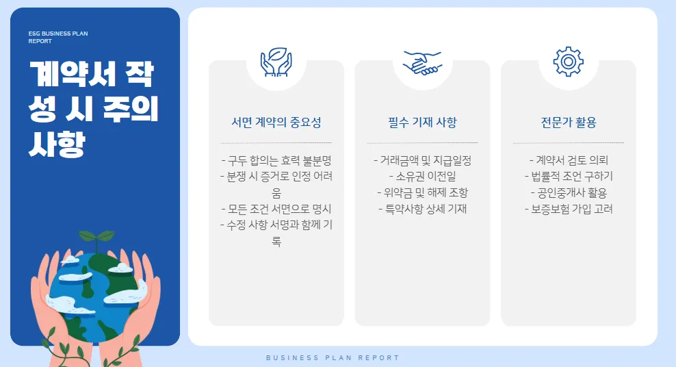 계약서를 작성할 때는 모든 조건을 서면으로 명시해야 합니다. 단순한 구두 합의는 효력이 불분명하며, 분쟁 발생 시 증거로 인정되지 않는 경우가 많습니다.