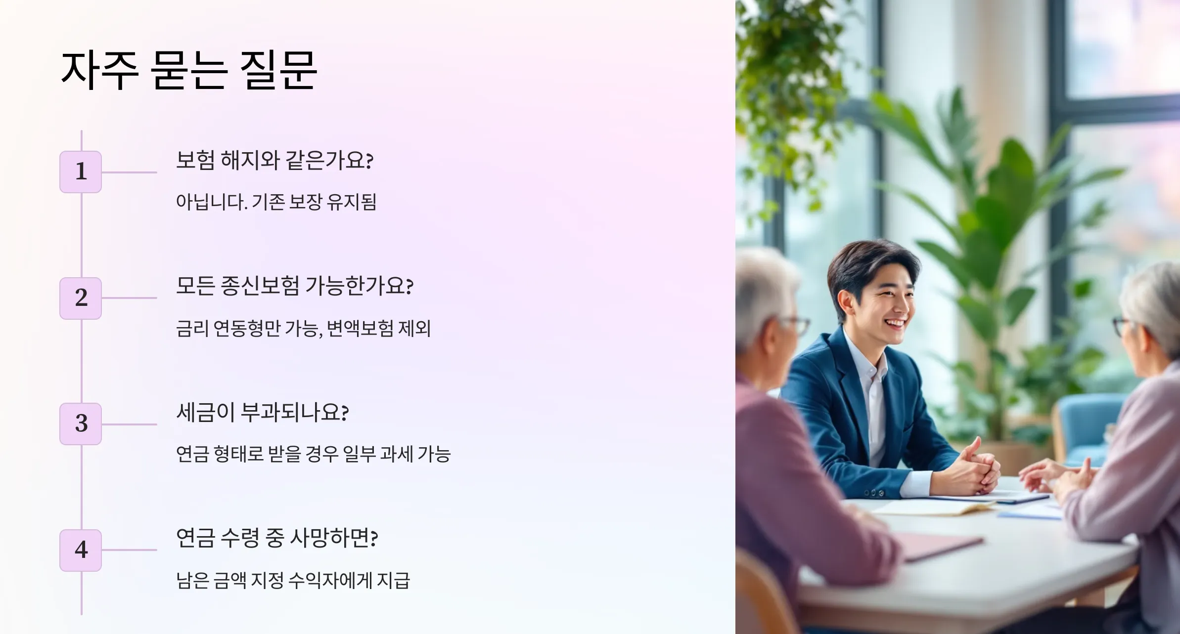 이제 곧 시행될 예정이니, 본인의 보험이 해당되는지 확인하고, 예상 연금 수령액을 계산한 후, 필요시 보험사에 상담을 받아보세요. 연금 전환은 신중한 결정이 필요한 만큼, 가족과 충분히 상의하는 것도 좋은 방법입니다.