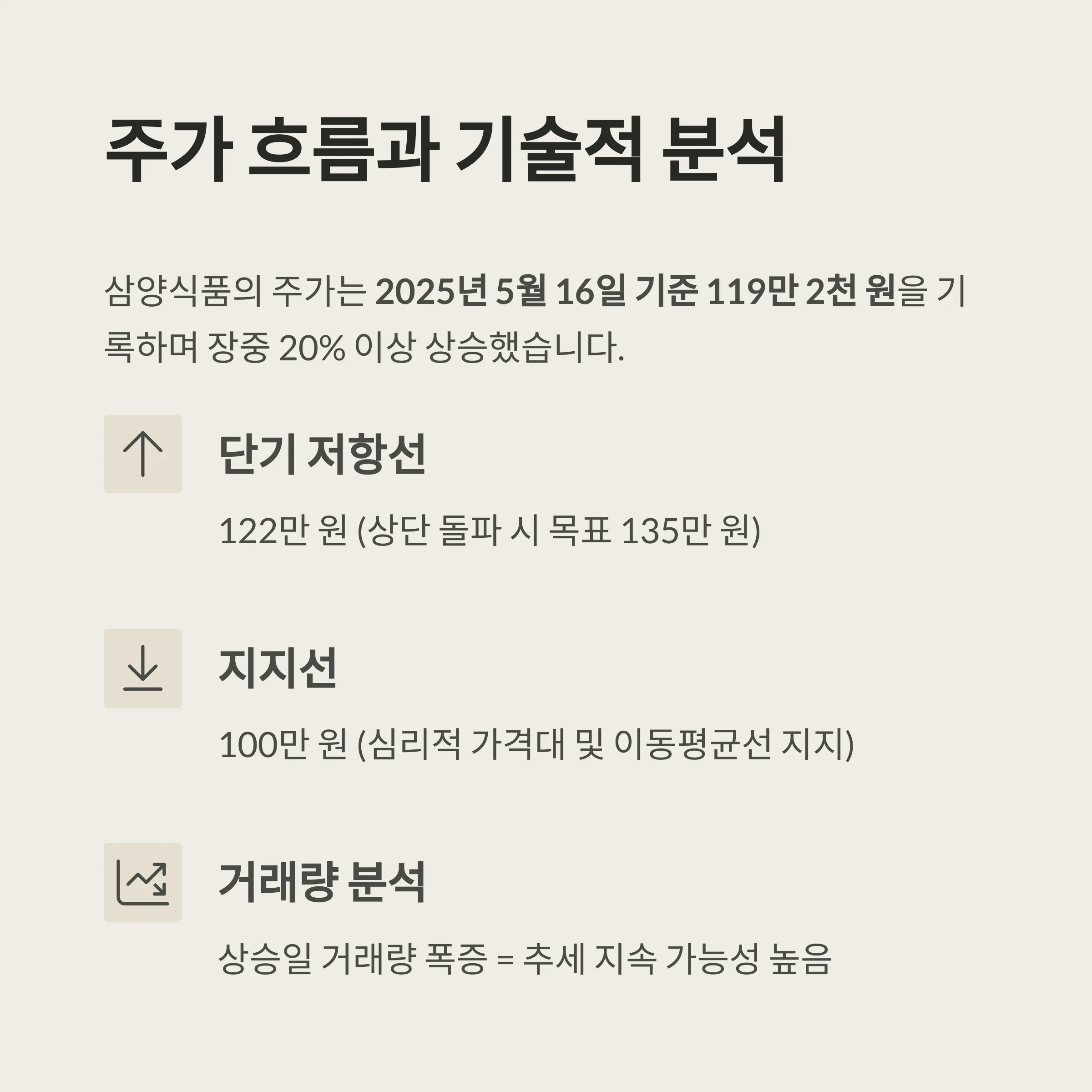 삼양식품의 주가는 2025년 5월 16일 기준 119만 2천 원을 기록하며 장중 20% 이상 상승했습니다. 이는 사상 최고가에 육박하는 수준으로, 기술적 분석 관점에서는 다음과 같습니다: