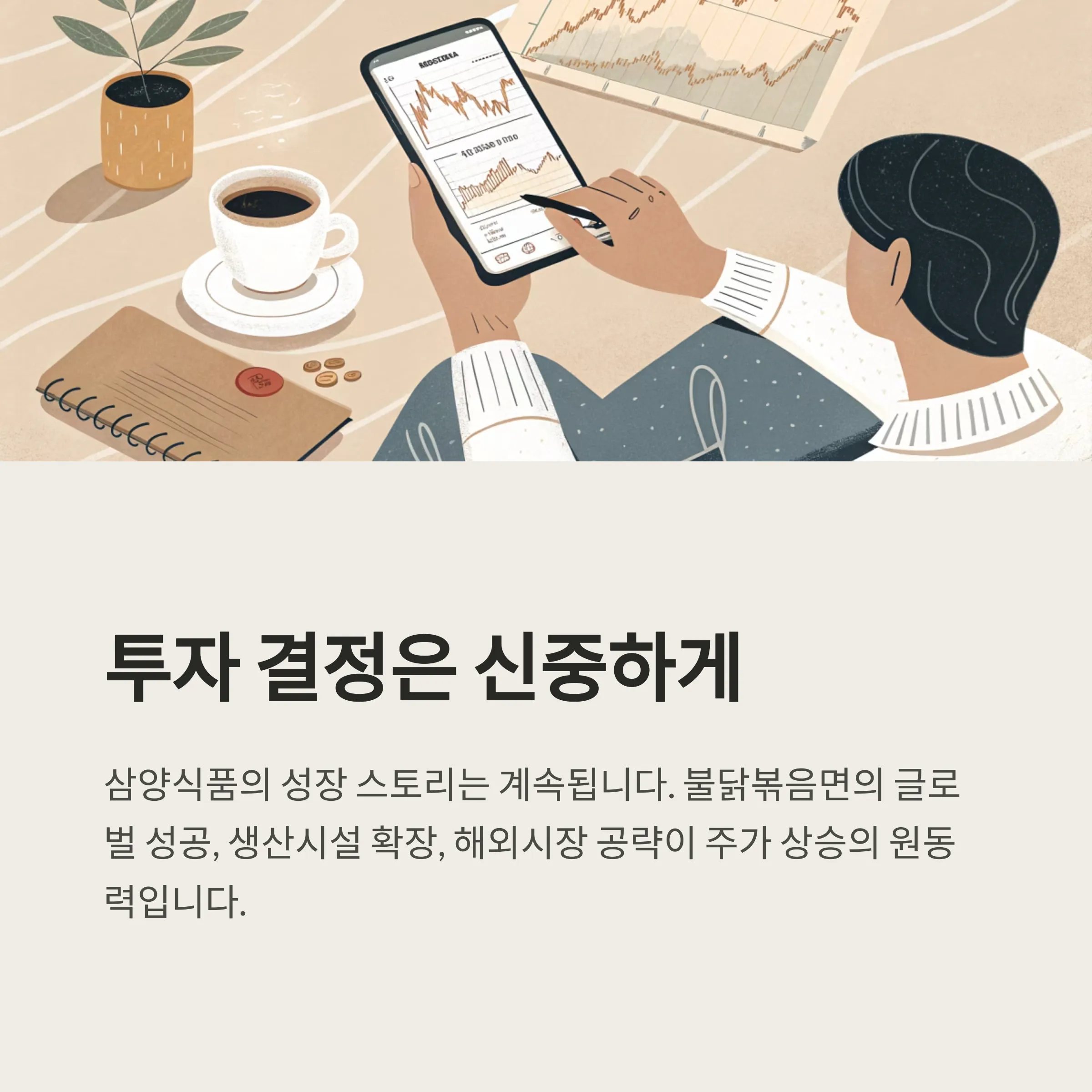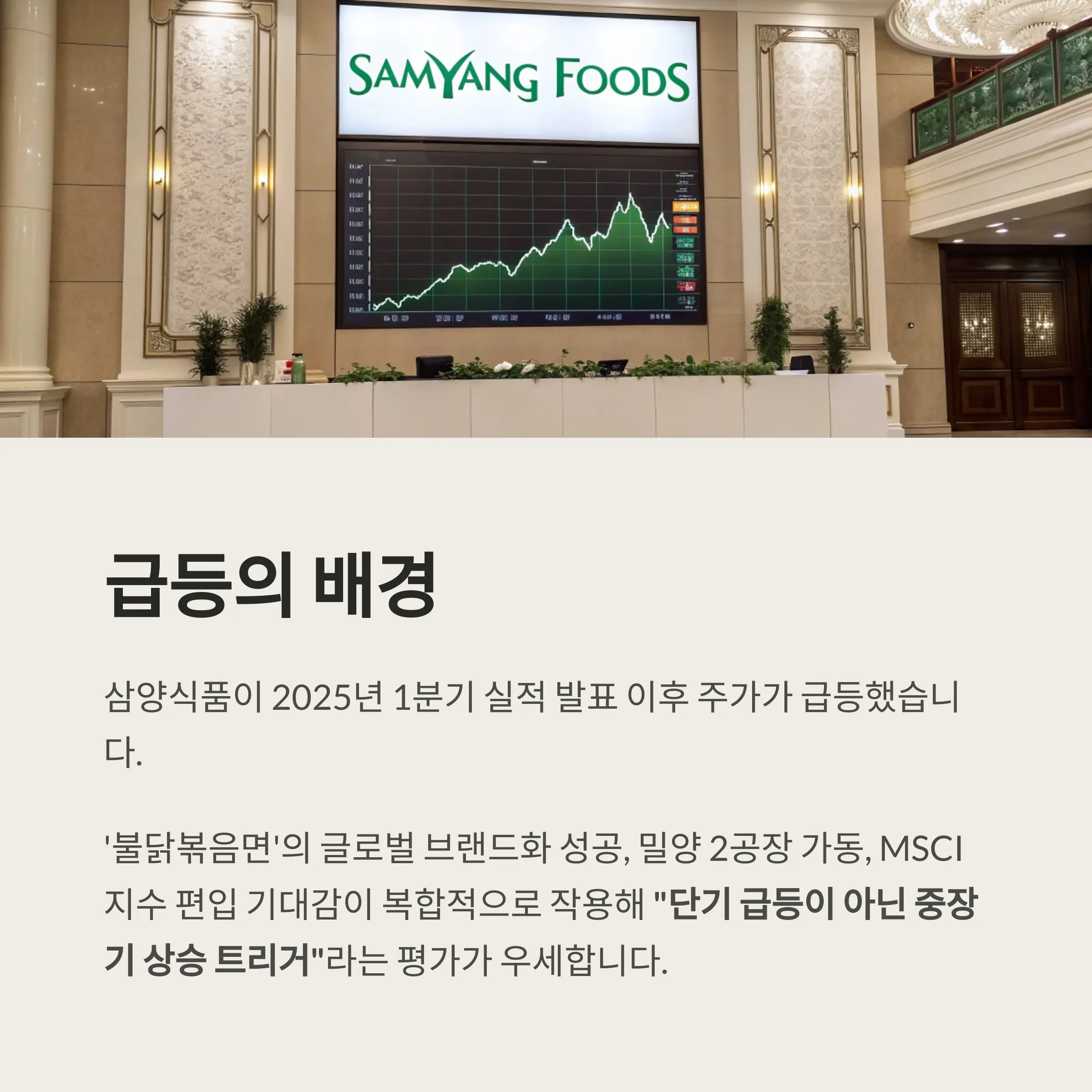 특히 ‘불닭볶음면’의 글로벌 브랜드화 성공과 밀양 2공장 가동, MSCI 지수 편입 기대감 등 여러 요인이 복합적으로 작용하고 있어 “단기 급등이 아닌 중장기 상승 트리거”라는 평가가 우세합니다.