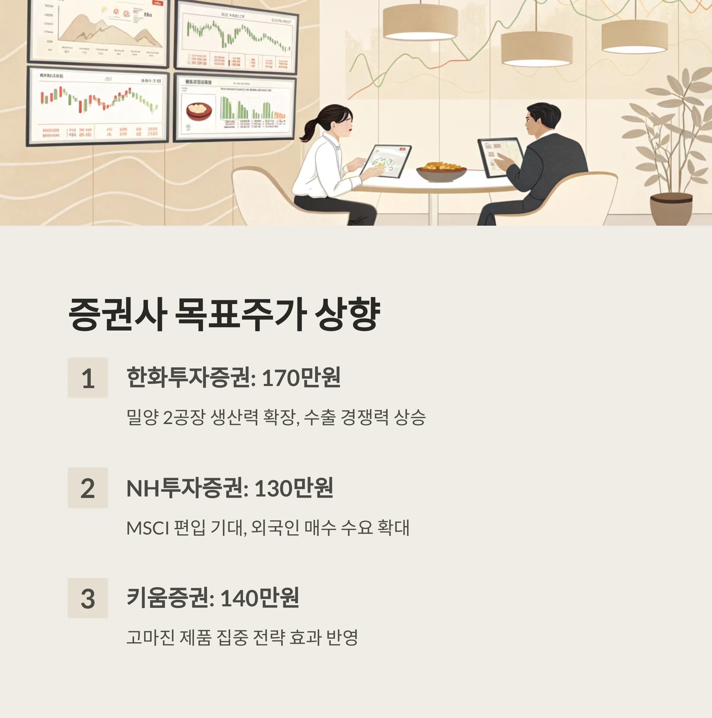 다수 증권사들은 삼양식품의 목표주가를 130만~170만 원 수준으로 상향 조정했습니다.