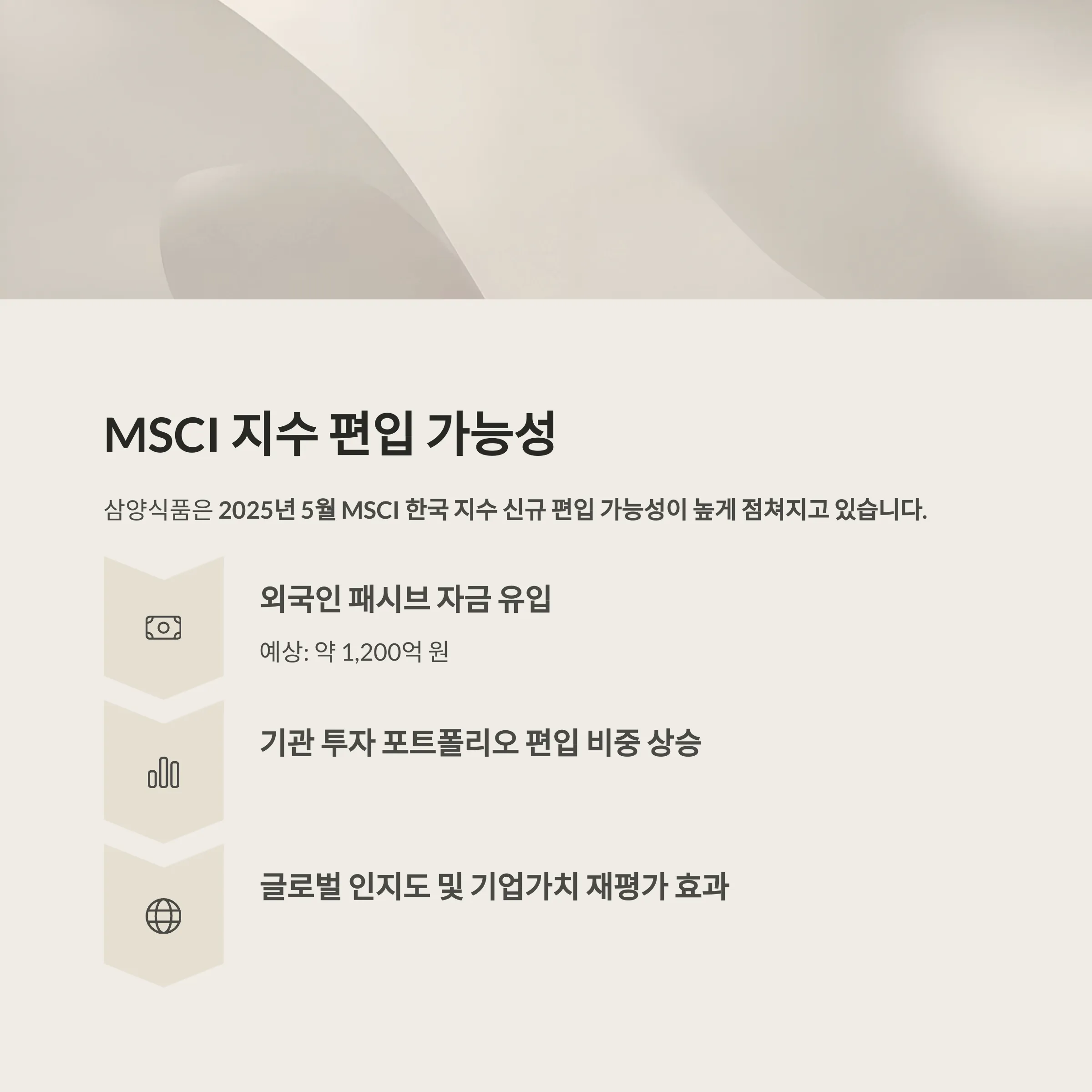 삼양식품은 2025년 5월 MSCI(모건스탠리캐피털인터내셔널) 한국 지수 신규 편입 가능성이 높게 점쳐지고 있습니다.