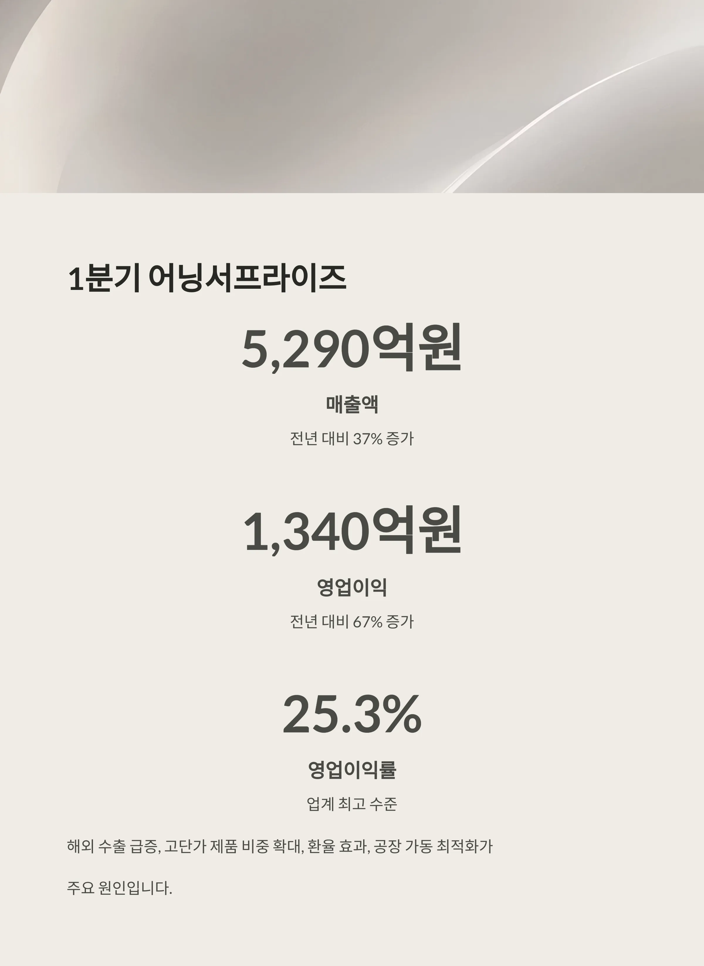 | 영업이익 | 1,340억 원 | +67% 증가 | 약 +28% 초과 |