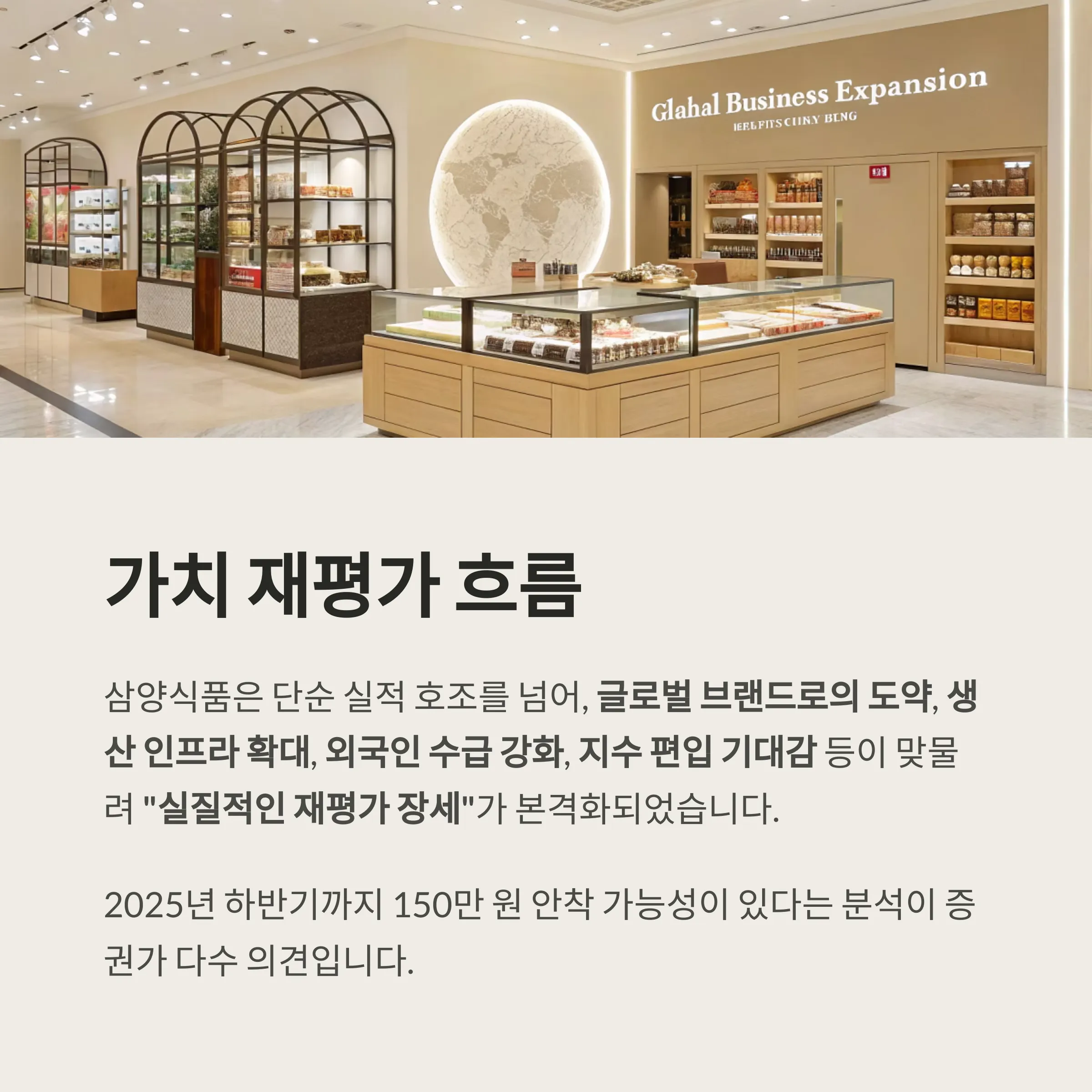 삼양식품은 현재 단순 실적 호조를 넘어서, 글로벌 브랜드로의 도약, 생산 인프라 확대, 외국인 수급 강화, 지수 편입 기대감 등이 맞물려 “실질적인 재평가 장세”가 본격화된 모습입니다.