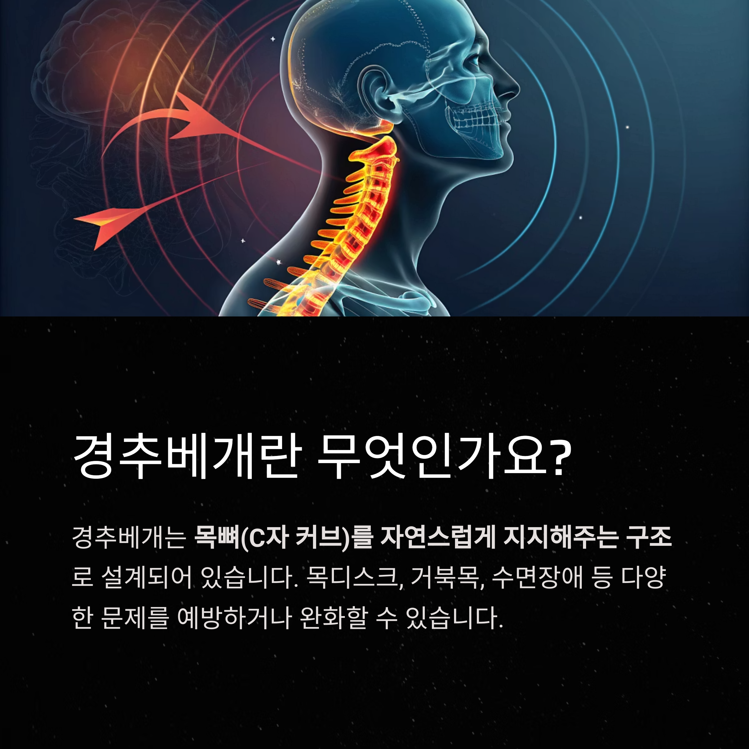 경추의 각도와 위치를 맞춰줌으로써 목디스크, 거북목, 수면장애 등 다양한 문제를 예방하거나 완화할 수 있습니다.