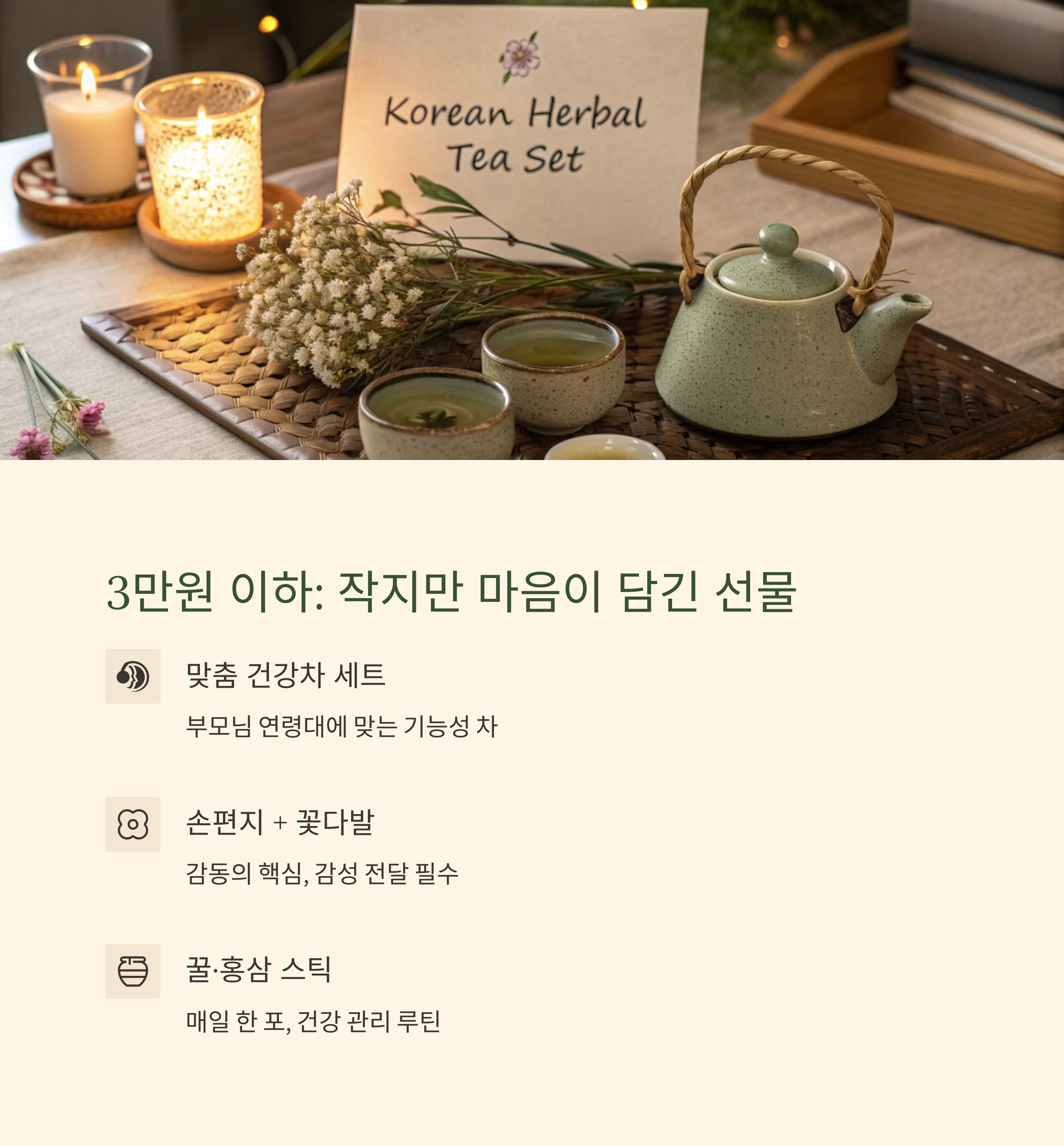 | 5만원 | 건강차 세트 + 손편지 + 꽃 |
