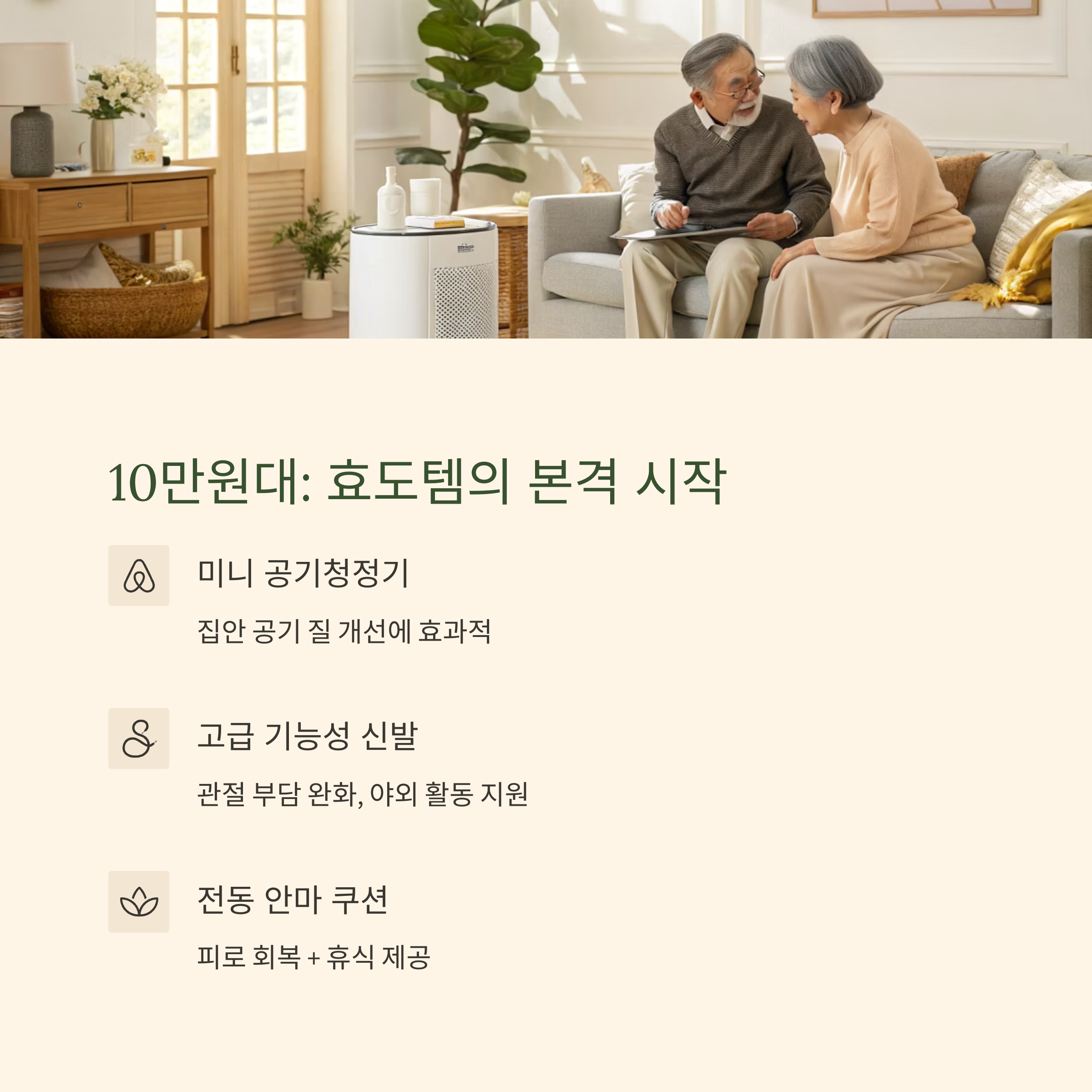 10만 원 이상의 예산이 생기면 기능성 가전 또는 프리미엄 건강 제품이 가능합니다.