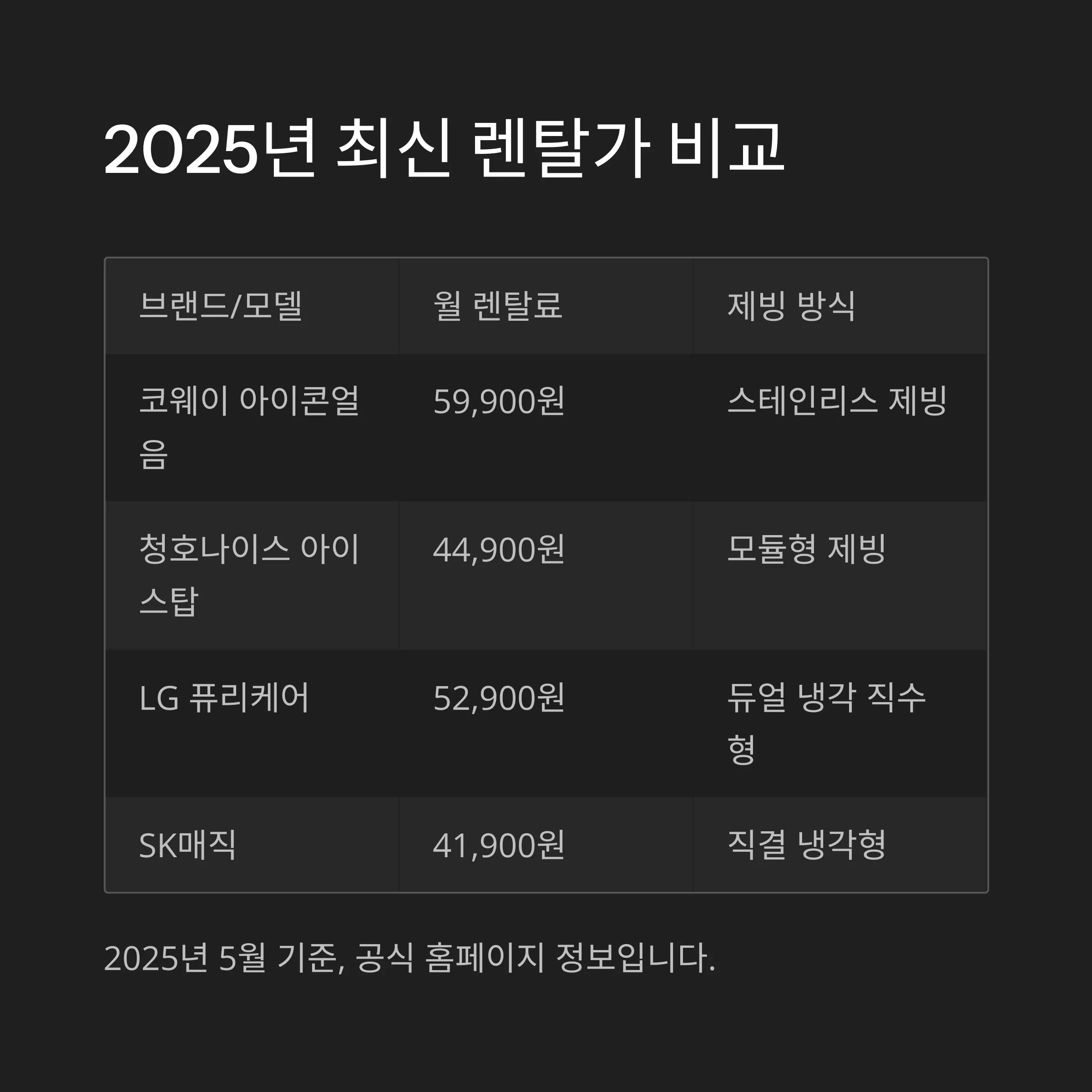 아래 표는 2025년 5월 기준, 공식 홈페이지를 통해 확인한 정확한 렌탈료와 핵심 사양을 비교한 최신 정보입니다.