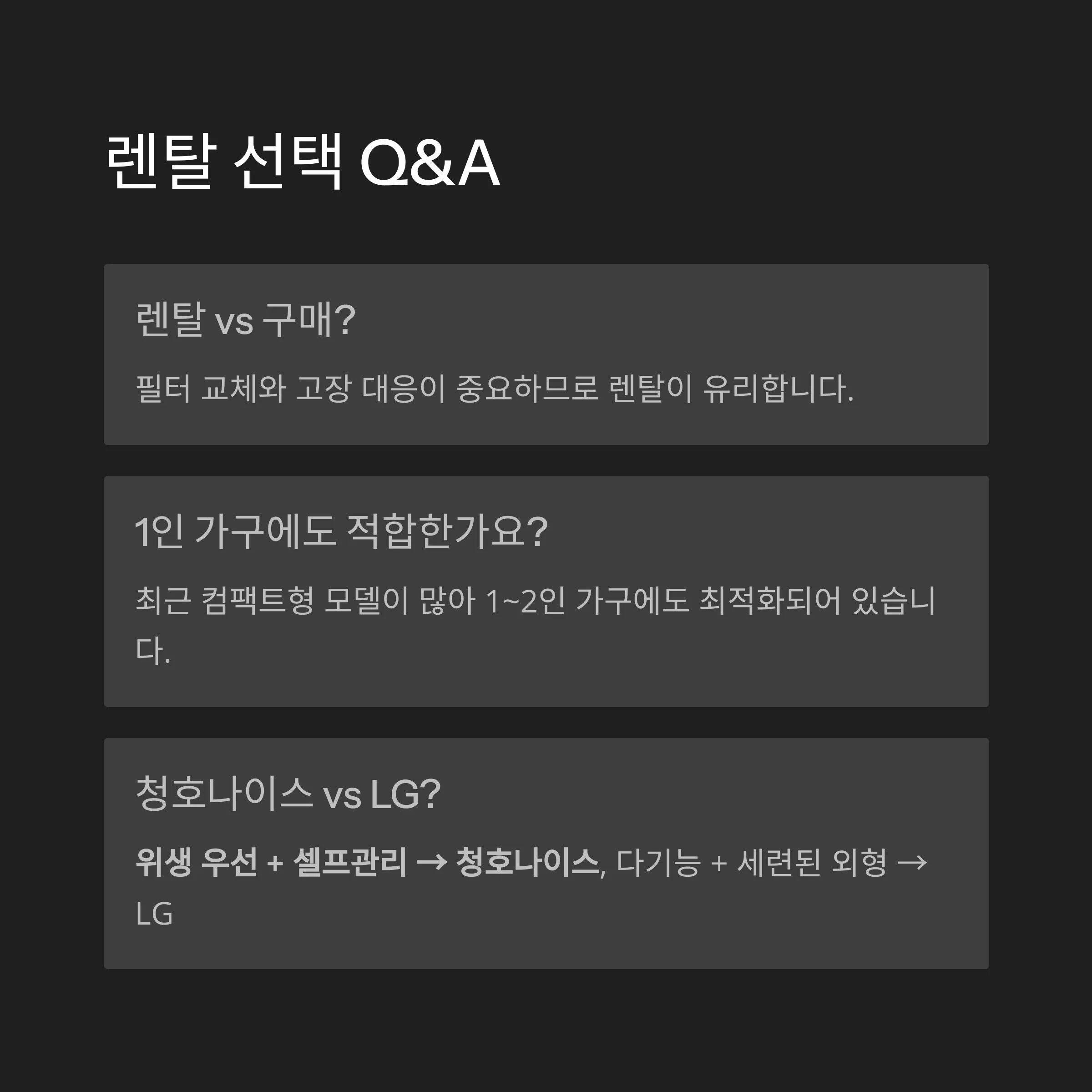 → 위생 우선 + 셀프관리 → 청호나이스, 다기능 + 세련된 외형 → LG가 좋습니다.