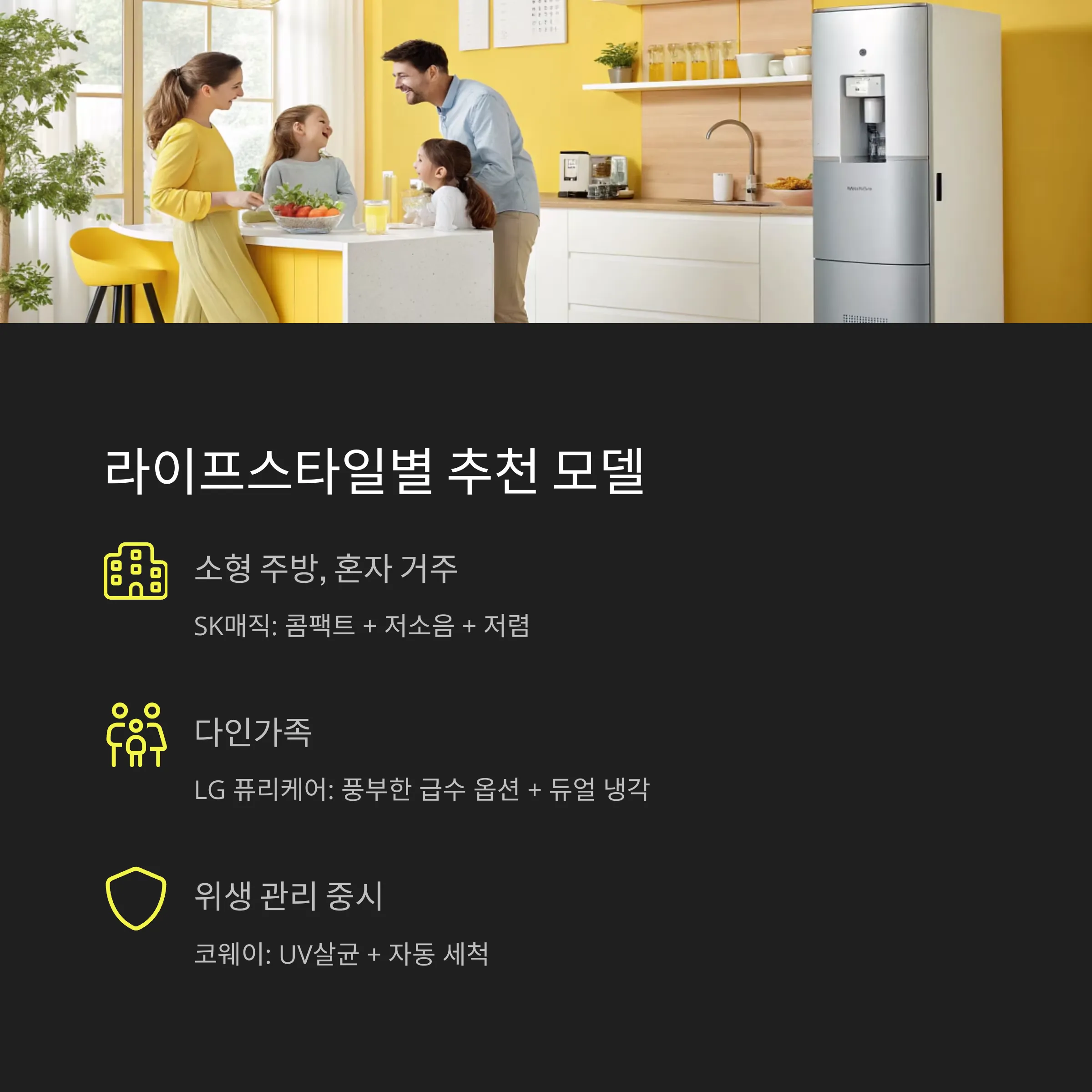 | 다인가족 사용 | LG 퓨리케어 | 풍부한 급수 옵션 + 듀얼 냉각 |