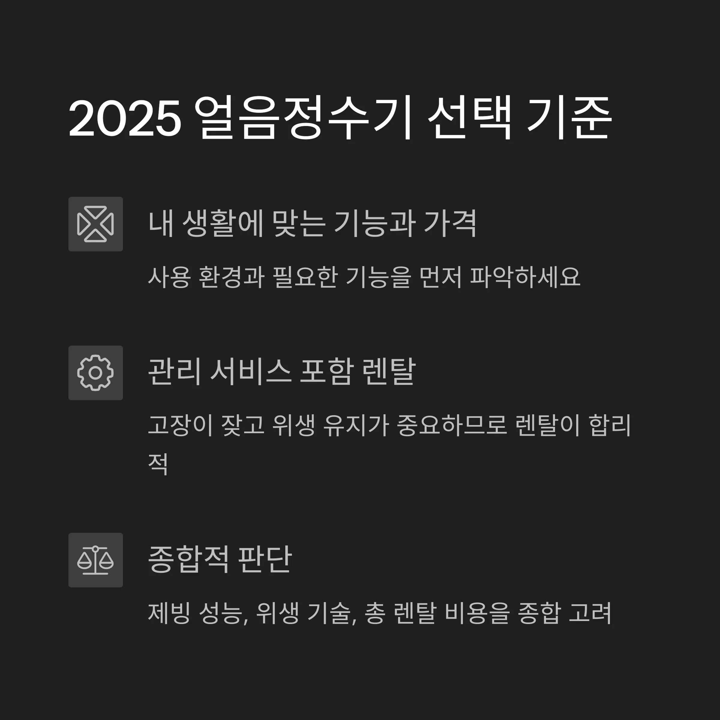 제빙 성능, 위생 기술, 총 렌탈 비용을 종합해 현명한 선택을 하시길 바랍니다.