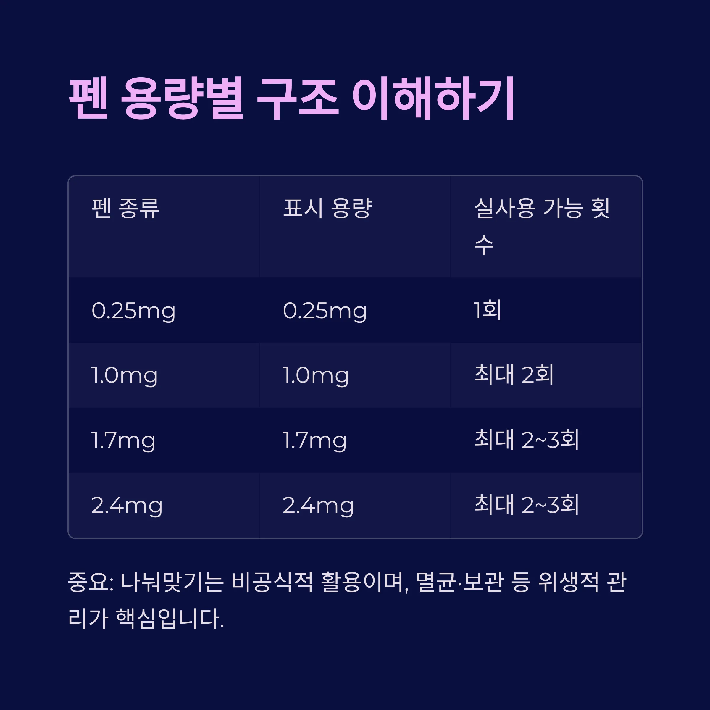 특히 펜에서 뽑아내는 방식은 주사액 손실과 감염 우려가 있어, 무균 상태 유지가 필수입니다.