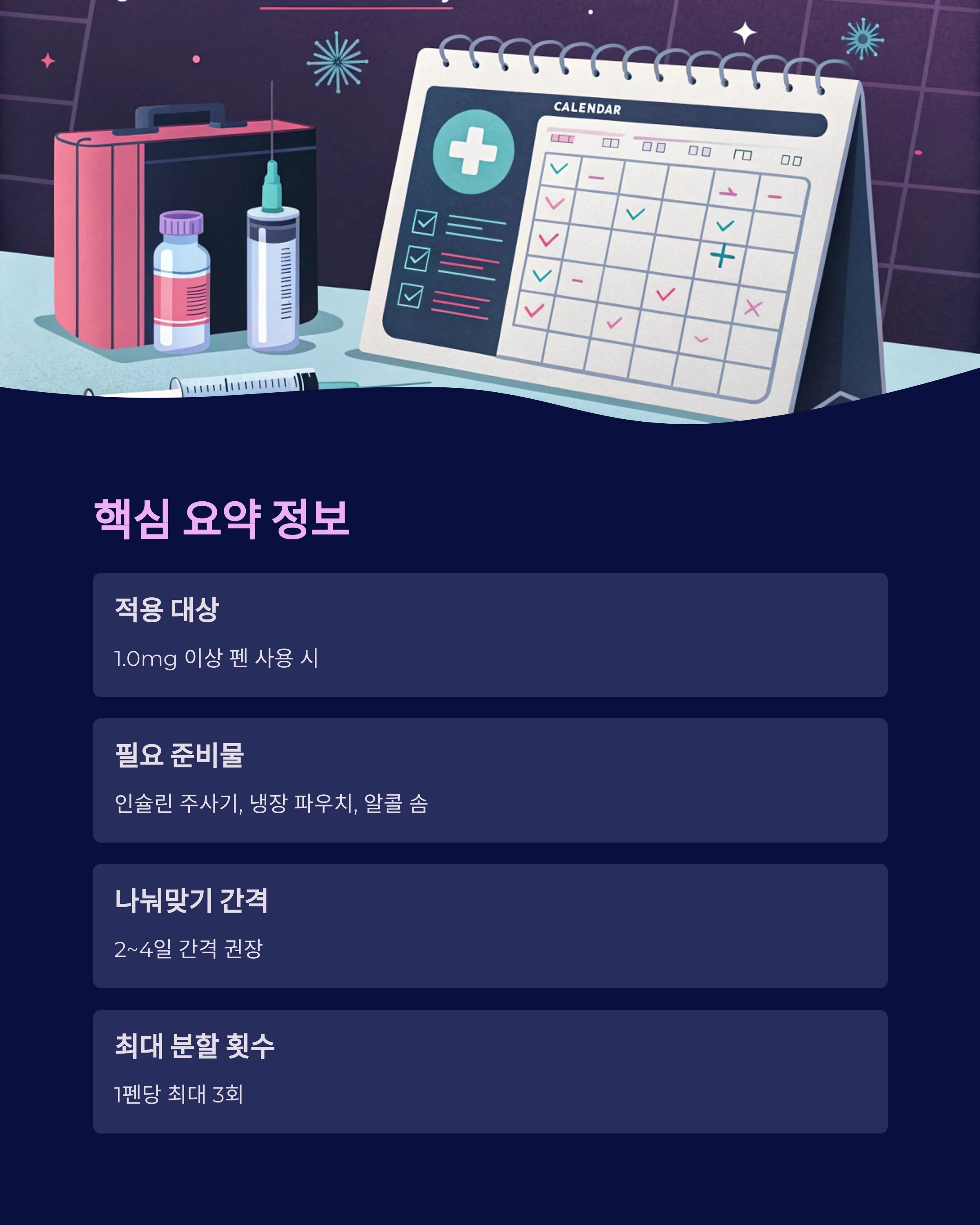 | 필요 준비물 | 인슐린 주사기, 냉장 파우치, 알콜 솜 |