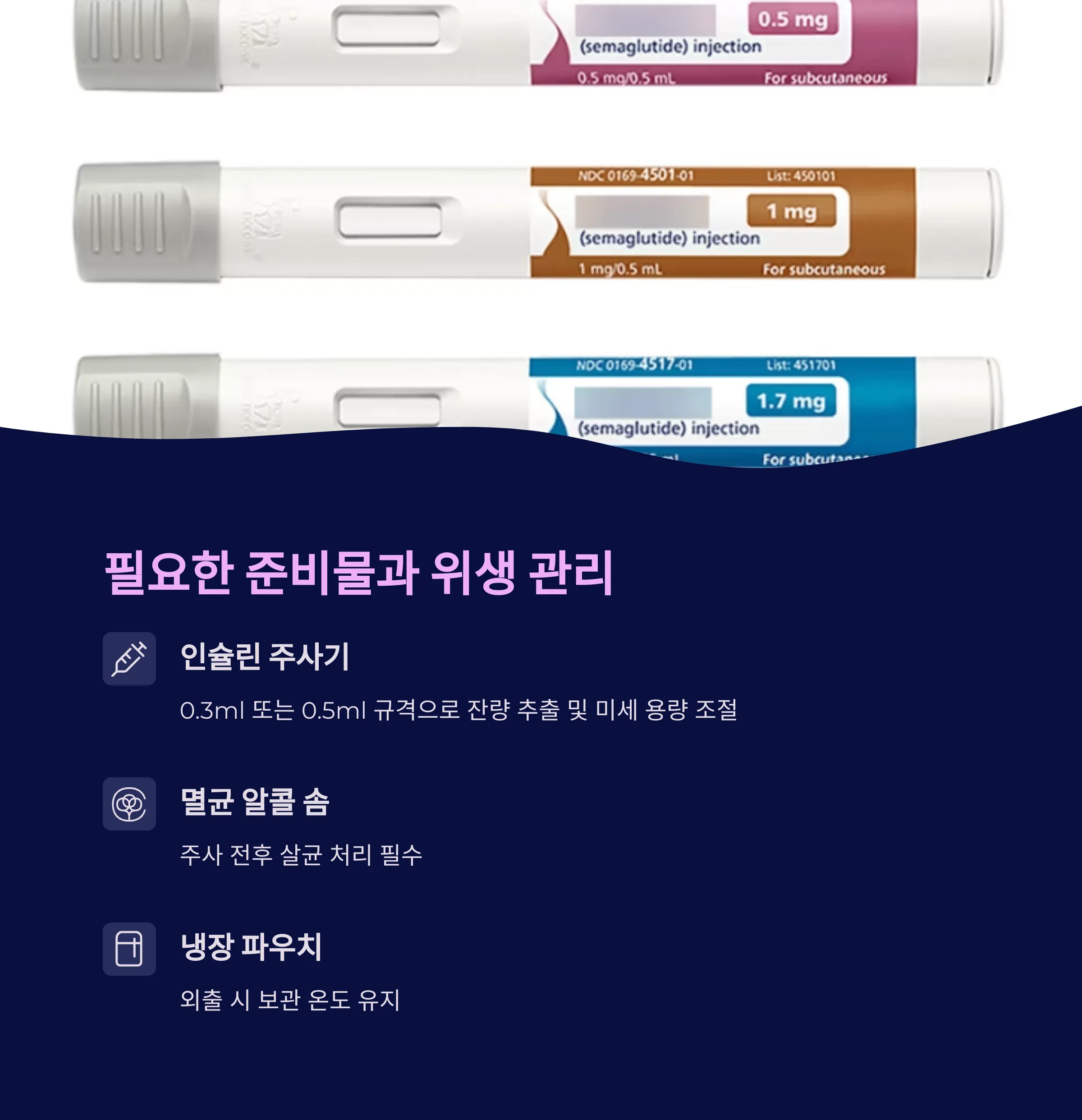 기본적으로 인슐린 주사기(0.3ml 또는 0.5ml), 냉장 보관 가능한 파우치, 알코올 솜이 필요합니다.