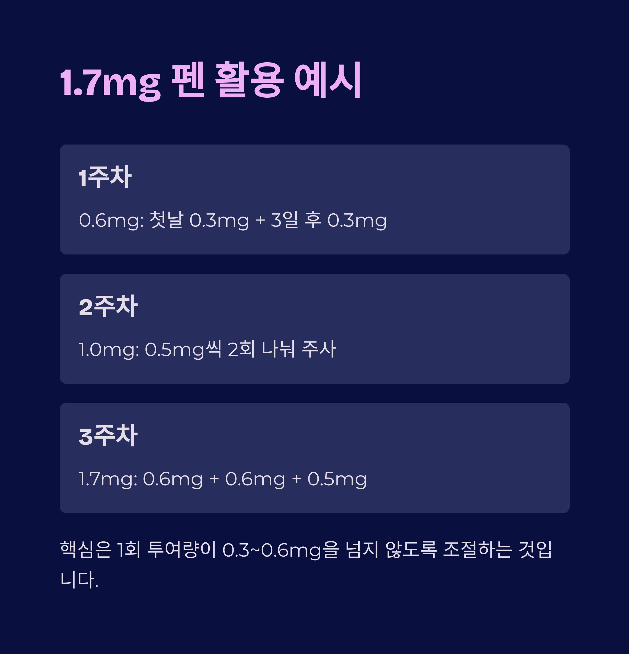 | 2주 | 1.0mg | 0.5mg씩 2회 나눠 주사 |
