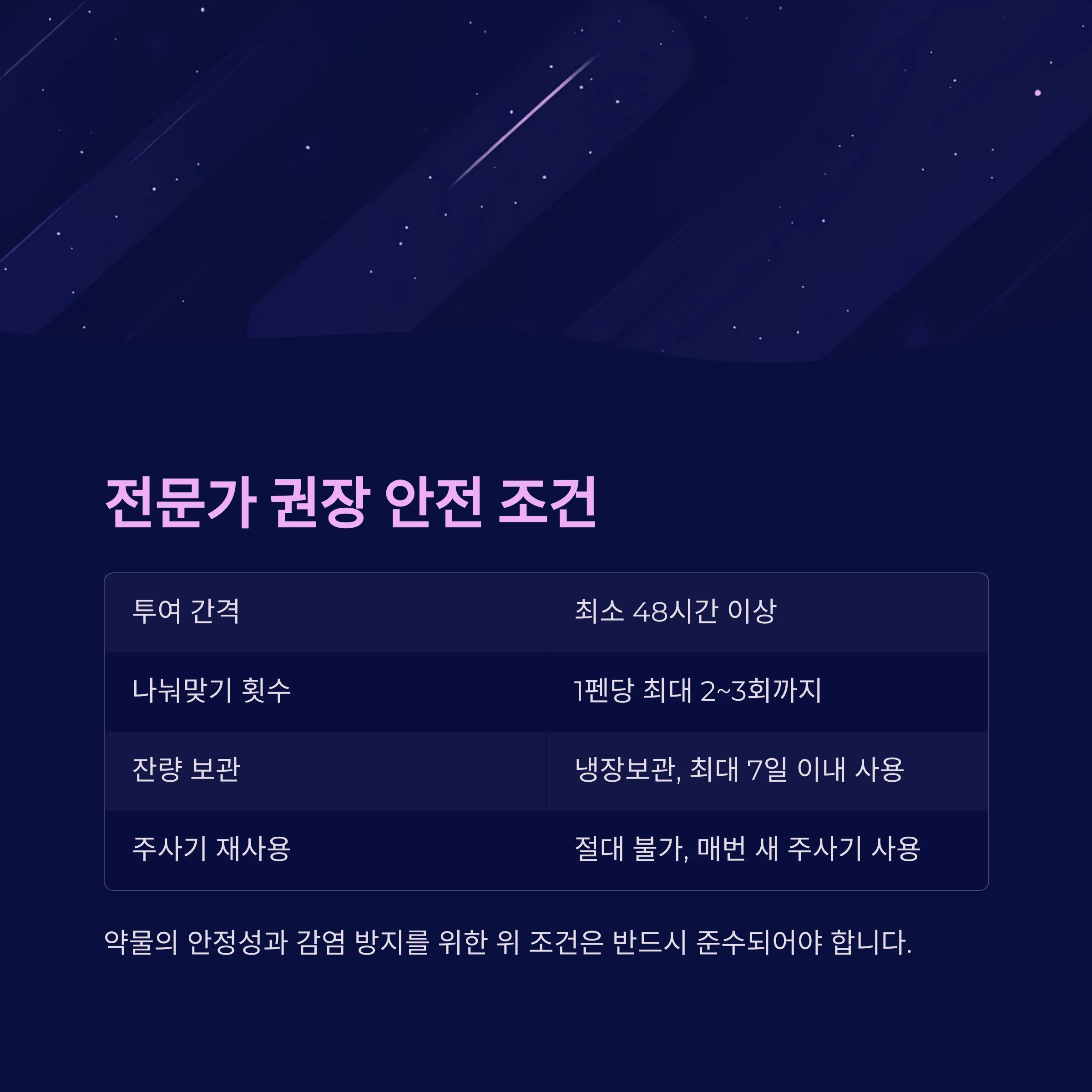 | 주사기 재사용 여부 | 절대 불가, 매번 새 주사기 사용 |