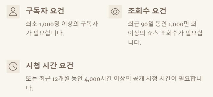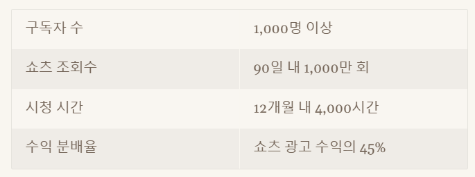90일 내 1,000만 회 쇼츠 조회수 또는 12개월 내 4,000시간 시청 시간 |