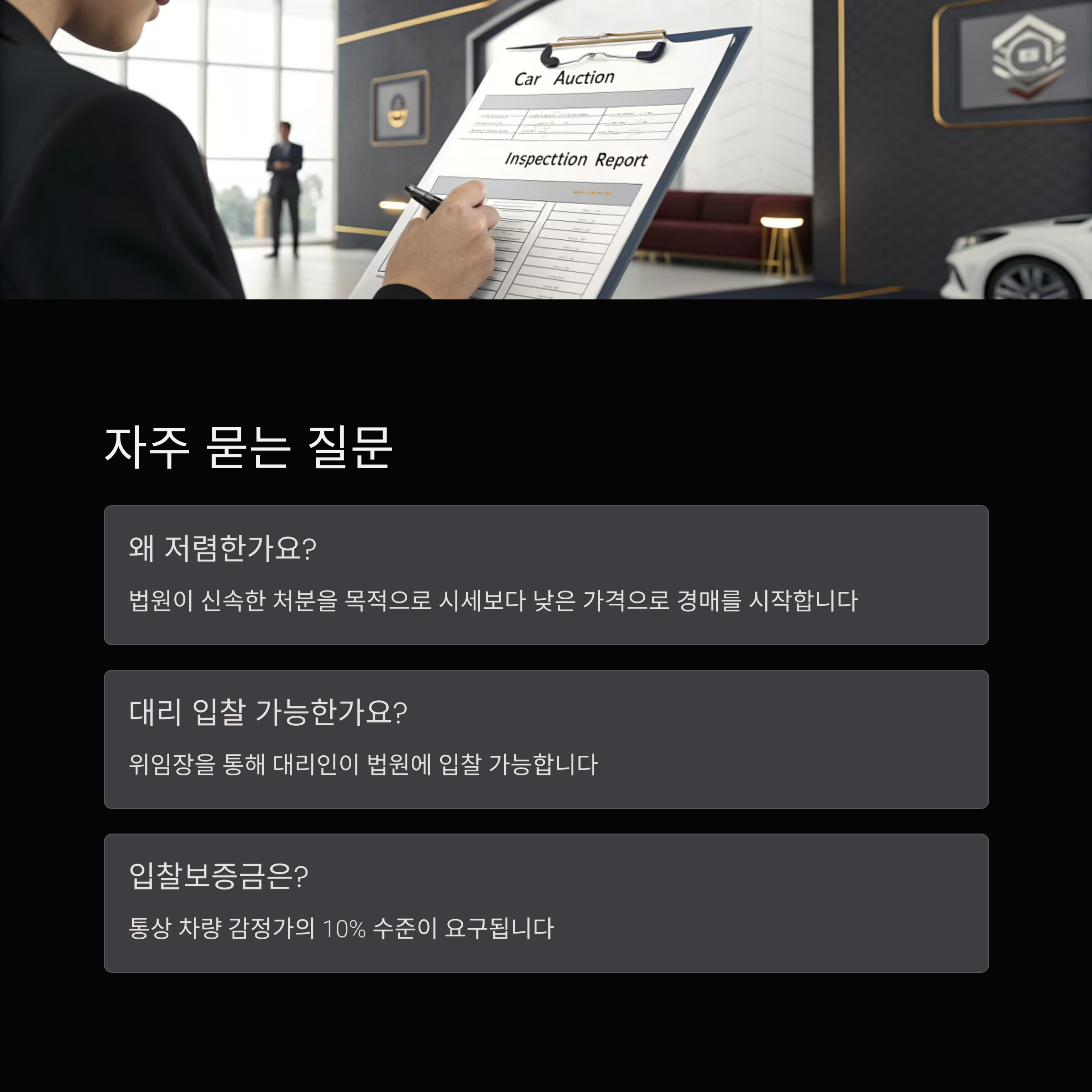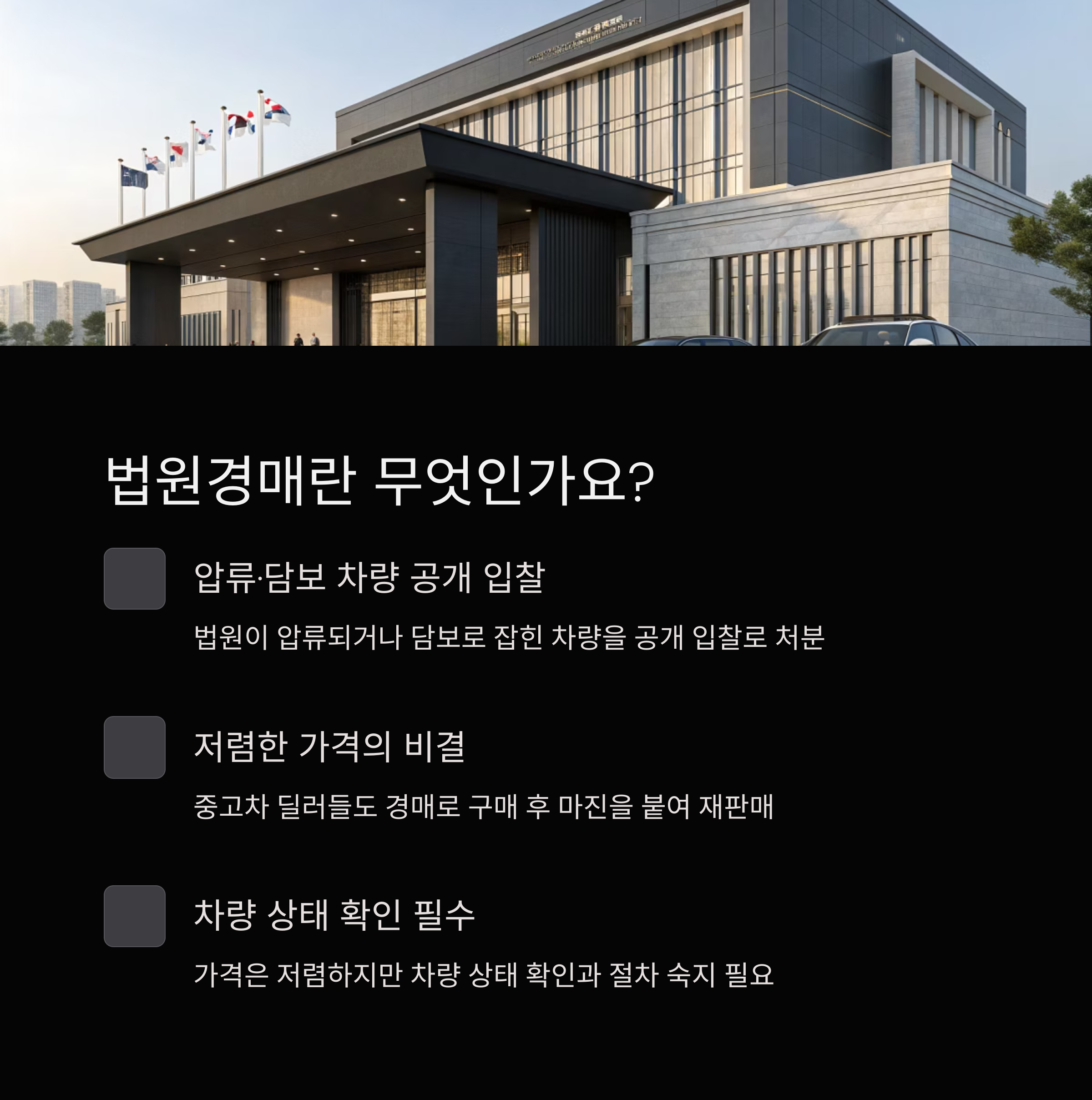 일반 중고차 시장보다 가격이 저렴한 대신, 차량 상태 확인과 절차 숙지가 필요합니다.