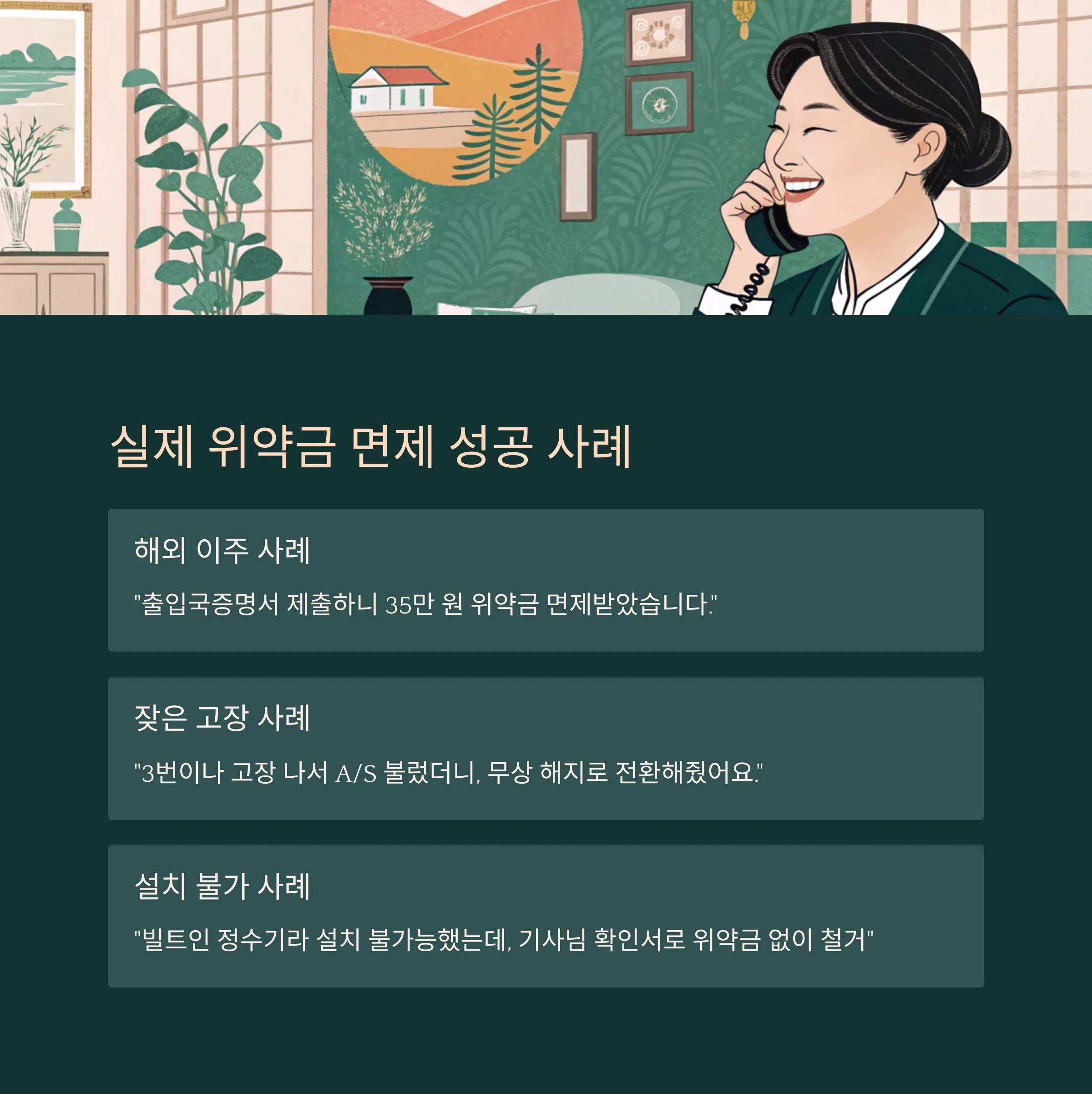 "저는 해외 이주로 정수기를 더 이상 사용할 수 없었어요. 위약금이 35만 원이었는데, 출입국증명서 제출하니 면제받았습니다."