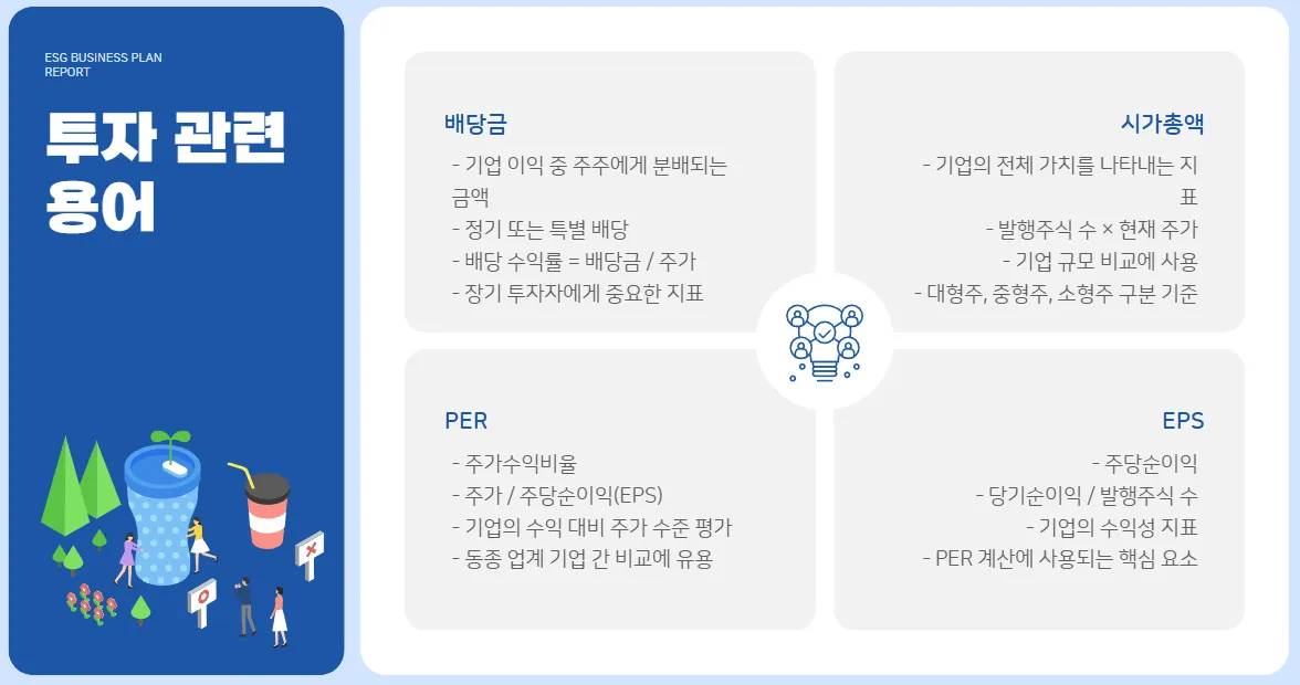 - EPS(Earnings Per Share): 주당순이익. 회사가 한 주당 얼마나 벌었는지를 보여주는 지표.