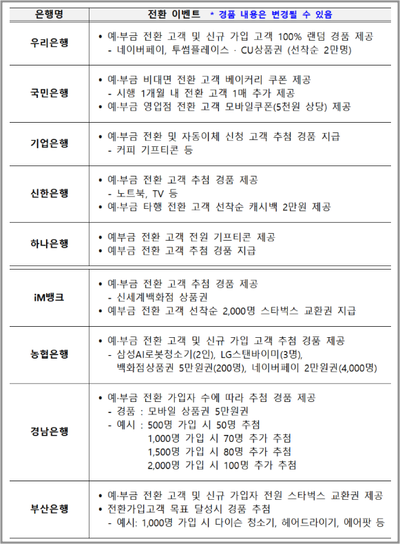위의 내용은 예시로, 실제 금리와 이벤트는 각 은행의 정책에 따라 다를 수 있습니다. 각 은행의 공식 웹사이트나 고객센터를 통해 최신 정보를 확인하시기 바랍니다.
