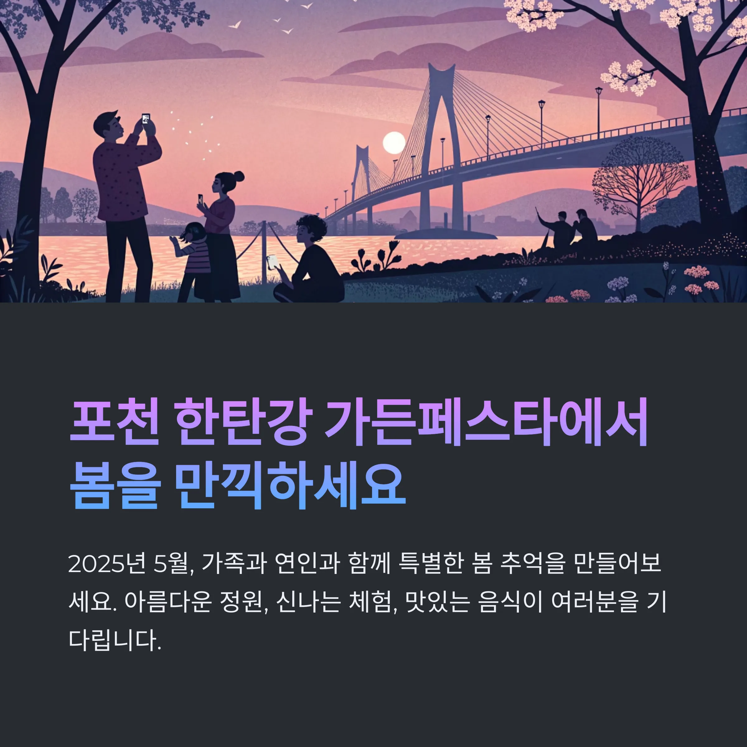 국내 최장 Y형 출렁다리 개통과 함께 포천의 힐링특별시 도약을 알리는 대표축제로, 전기자전거 체험부터 반려동물 놀이터, 가든 버스킹 등 다채로운 행사가 마련되어 있습니다.