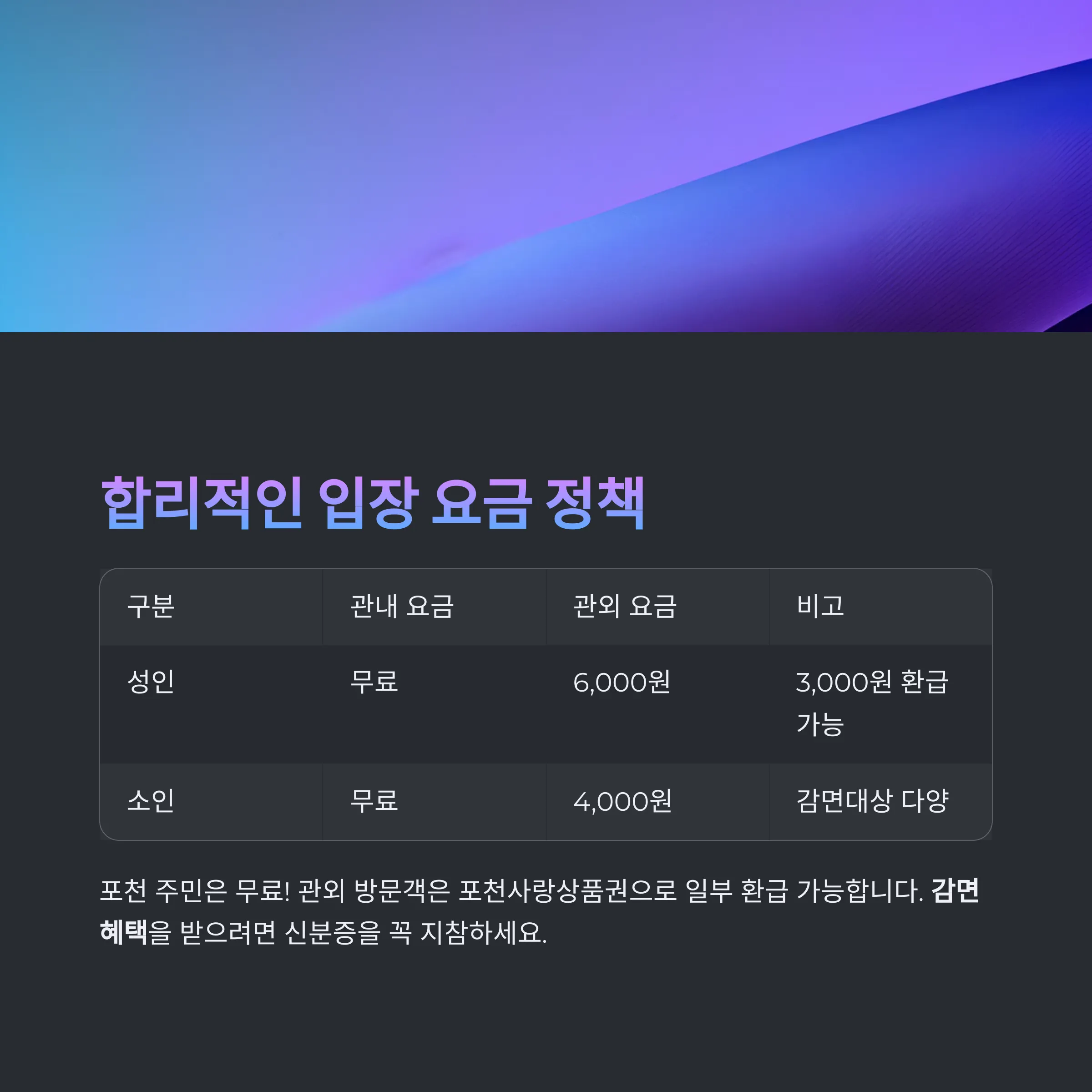 관내 주민에게는 무료 입장이 제공되며, 관외 방문객은 유료(성인 6,000원, 소인 4,000원)이나 포천사랑상품권으로 일부 환급이 가능합니다.