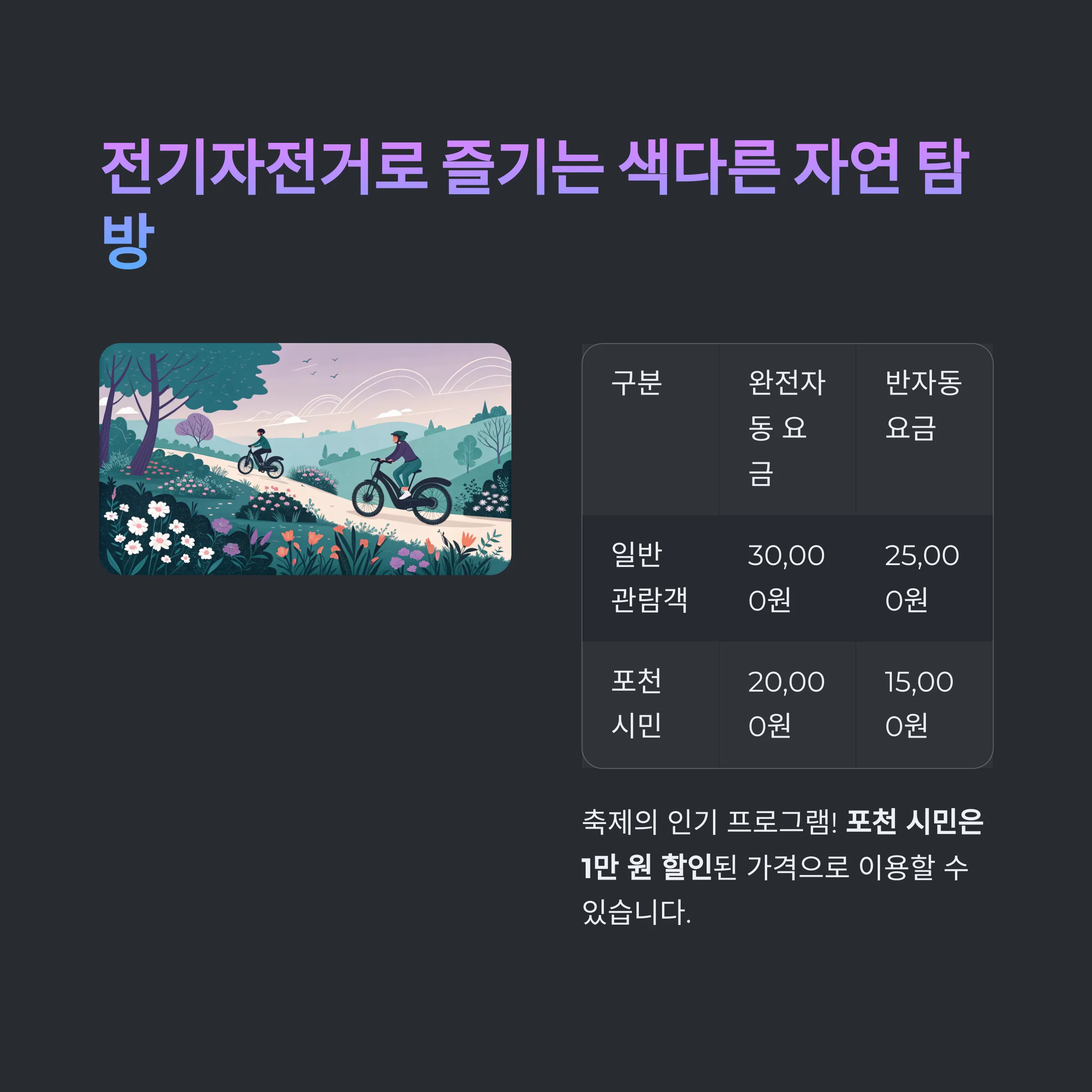 축제 현장에서 가장 인기 있는 프로그램 중 하나는 전기자전거 체험입니다. 완전자동과 반자동 모델로 나뉘며, 포천 시민은 1만 원 할인된 금액으로 이용할 수 있습니다.