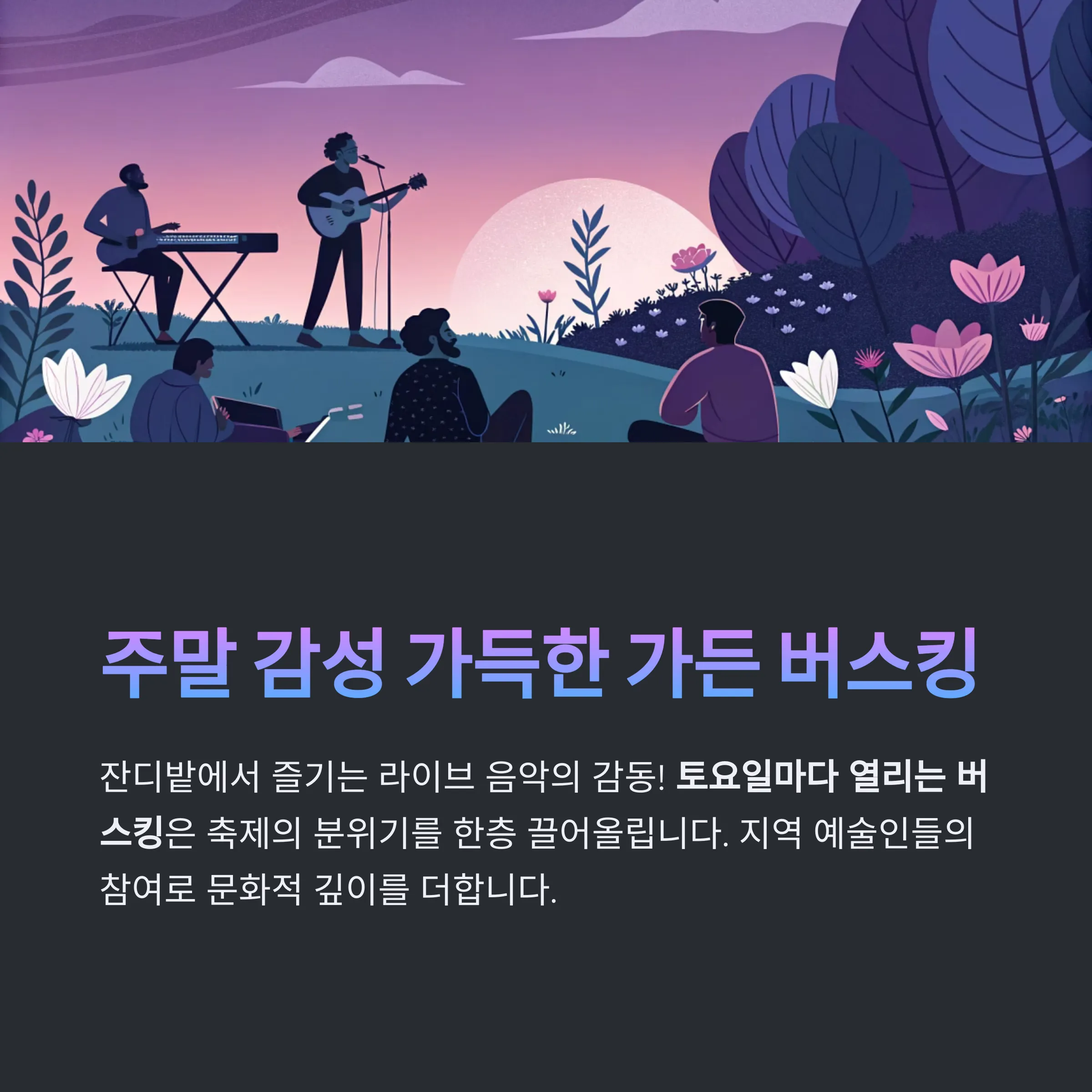 토요일마다 열리는 버스킹은 방문객의 만족도를 높이는 핵심 요소로 자리잡고 있으며, 지역 예술인의 참여로 문화적 깊이도 함께합니다.