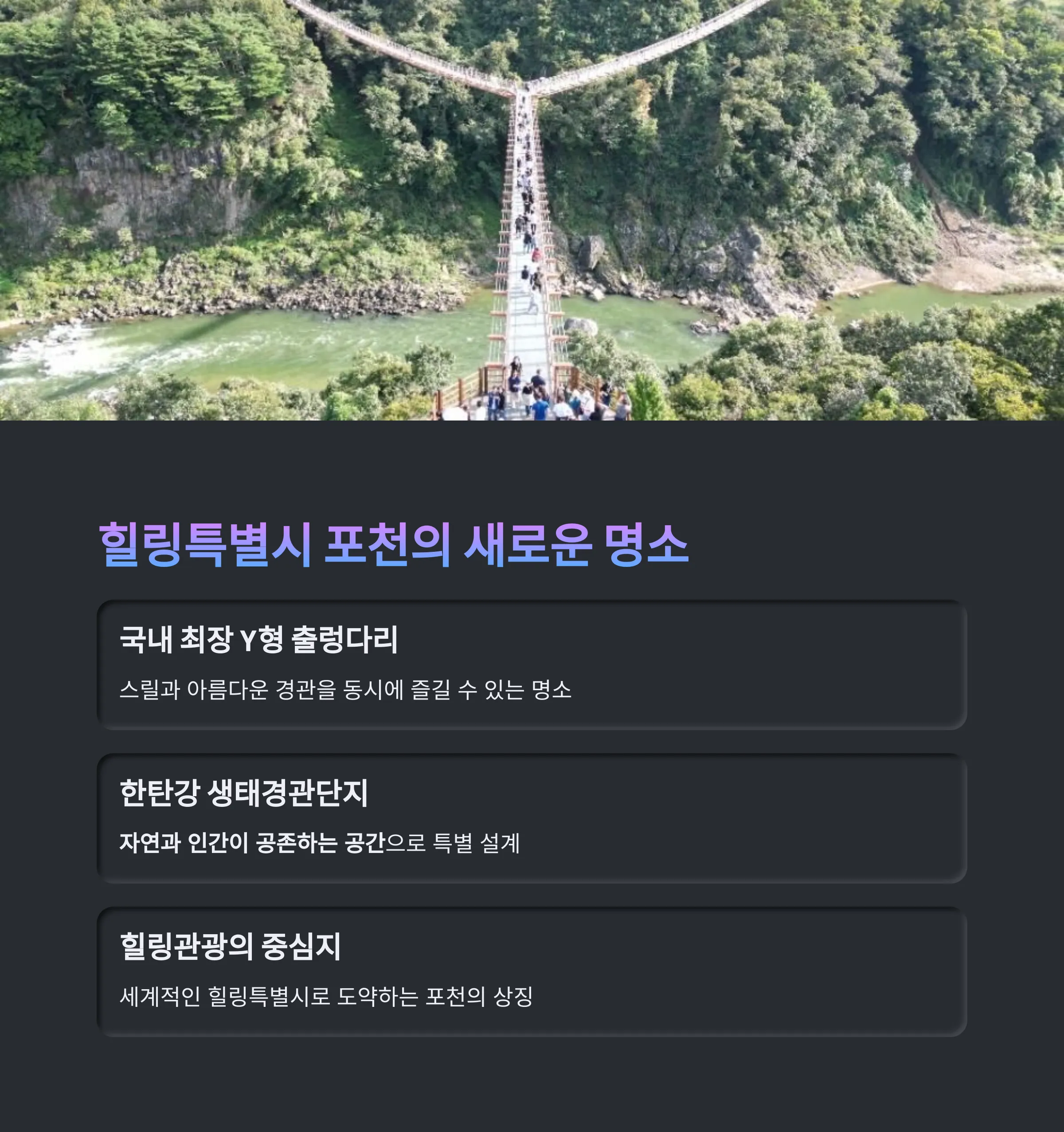 국내 최장 길이의 Y형 출렁다리가 개통되며 포천은 새로운 힐링관광의 중심지로 떠오르고 있습니다.