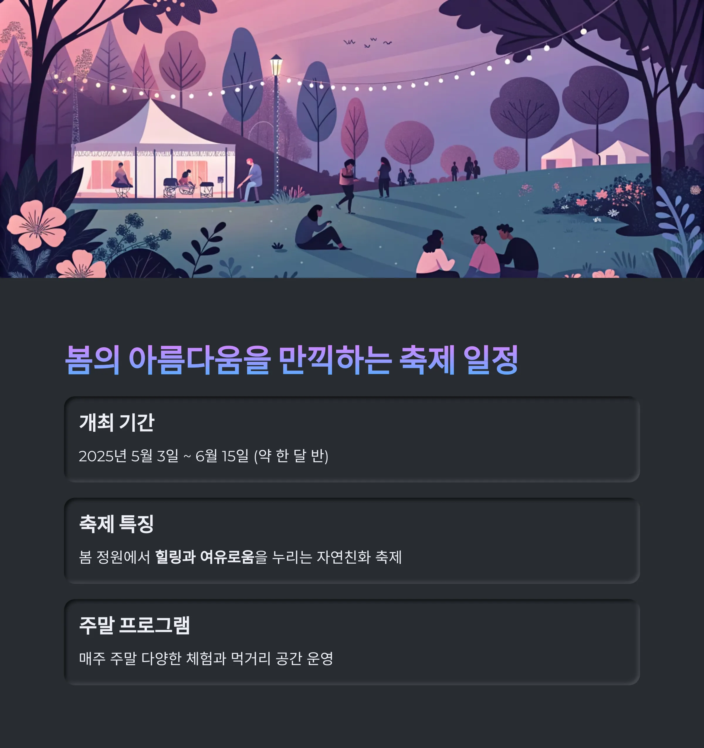 2025년 5월 3일부터 6월 15일까지 약 한 달 반 동안 펼쳐지는 이번 가든페스타는 봄 정원의 아름다움 속에서 힐링과 여유로움을 누릴 수 있는 대표적인 자연친화 축제입니다.