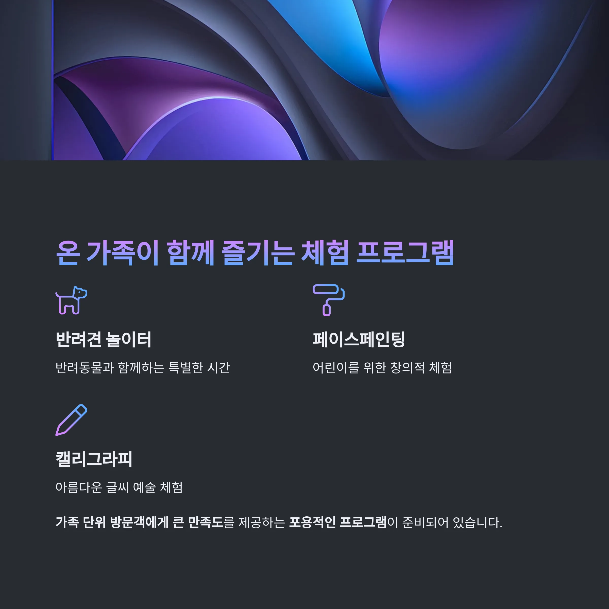 정원 내 마련된 반려견 놀이터, 어린이 대상 페이스페인팅, 캘리그라피 체험 등은 가족 단위 방문객에게 큰 만족도를 제공합니다.
