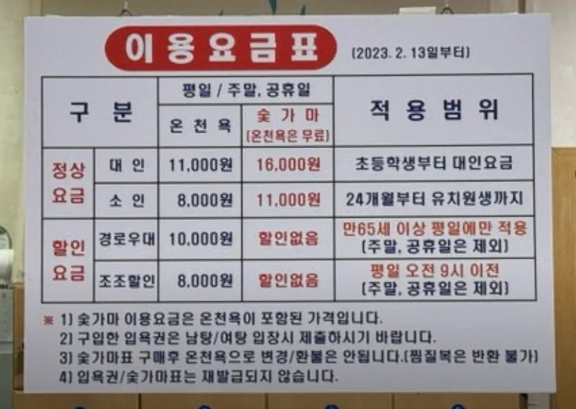 | 조조 할인 (06:00 - 09:00) | 온천만 이용 가능 | 성인 8,000원 |