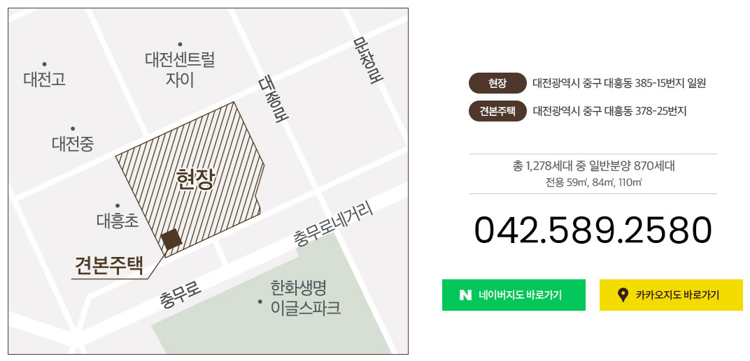 단지별로 살펴보면, 1단지는 전용면적 59㎡ 277가구, 84㎡ 42 가구로 구성되어 있으며, 2단지는 59㎡ 246 가구, 84㎡ 280 가구, 110㎡ 25 가구로 구성되어 있습니다.