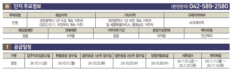 특별 공급은 21일, 1순위 청약은 22일, 2순위 청약은 23일에 진행됩니다. 당첨자 발표는 29일이며, 전매 제한 기간은 1년입니다.