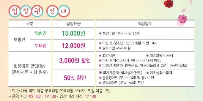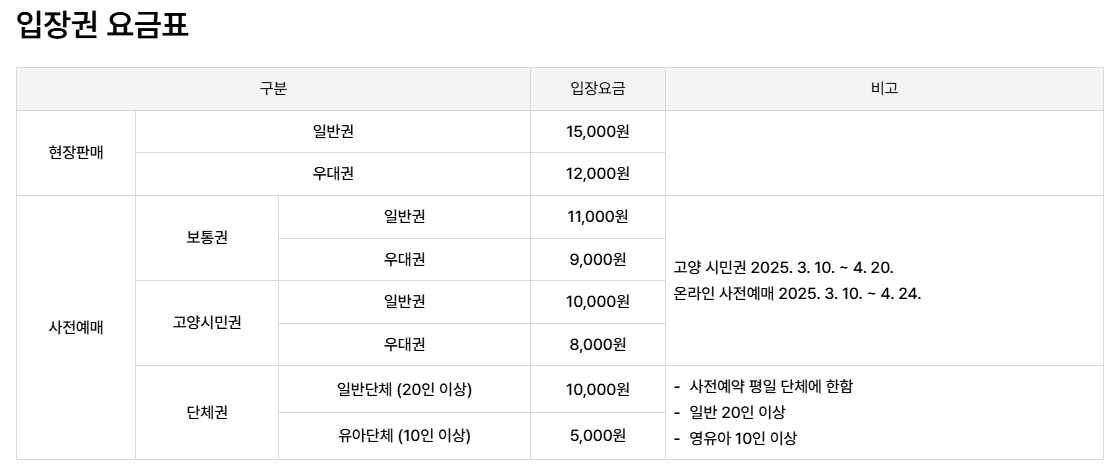 | 고양꽃박람회 일정 | 관람기간 : 2025. 4. 25(금) ~ 5.11(일) 관람시간: 09:00 ~ 19:00 입장 마감 시간 - 현장매표소 마감 17:20 - 입장마감시간 : 17:30 |